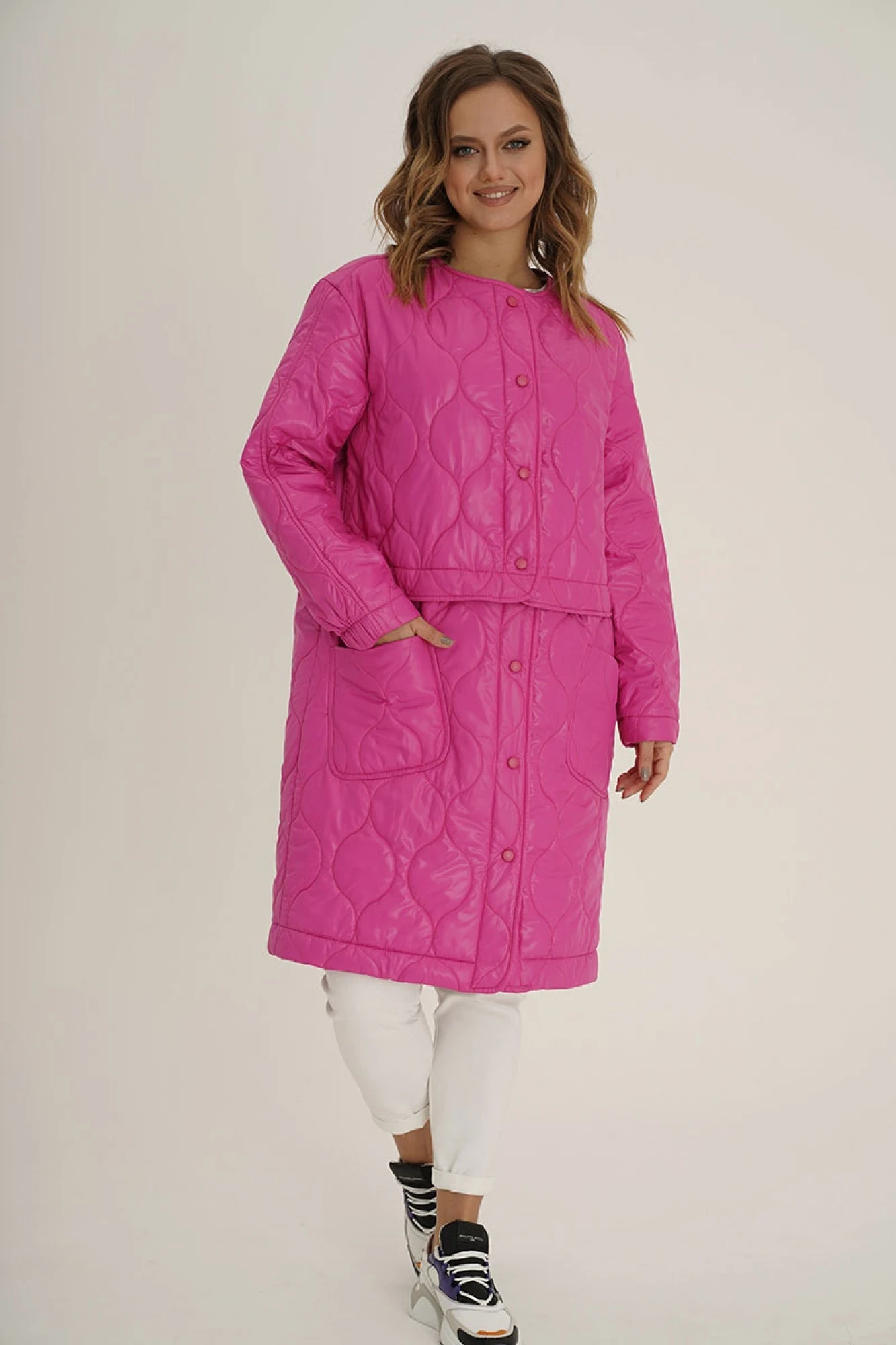 "Простых и невзрачных моделей в новом весеннем сезоне быть не должно! Интересный крой, замысловатый декор и яркие цвета – вот основной девиз и главное модное направление. Оригинальное пальто-трансформер, состоящее из двух частей, верхней и подстегивающейся нижней. Свободный оверсайз-силуэт, покрой втачной, со слегка заниженной линией плеча, застежка центральная на кнопке. Рукав втачной, с центральным швом и частично-эластичный в локтевой части. На нижней части пальто – накладные карманы. Спинка с отрезной кокеткой и центральным швом. Нижняя часть пальто легко отстегивается и оно трансформируется в укороченную стильную курточку.