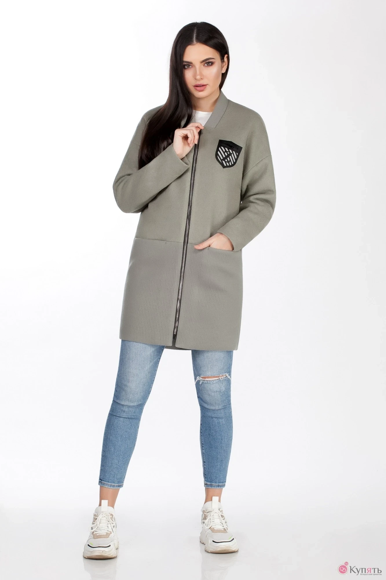 Пальто молодежное свободного силуэта, выполнено из валеной шерсти на сочетании двух тканей: гладкой и фактурной. Длина немного выше колена, хорошо смотрится и с сапогами, и с брюками. Впереди застежка - молния на основе контрастного цвета, такого же цвета и аппликация - карманчик. Воротник-полустойка. Ниже талии подрез и внутренние карманы,по спинке такой же подрез. Линия плеча приспущена, рукав длинный. Пальто полностью на подкладке. лина пальто сзади по спинке от плечевого шва 88 см, длина рукава пальто 63 см.