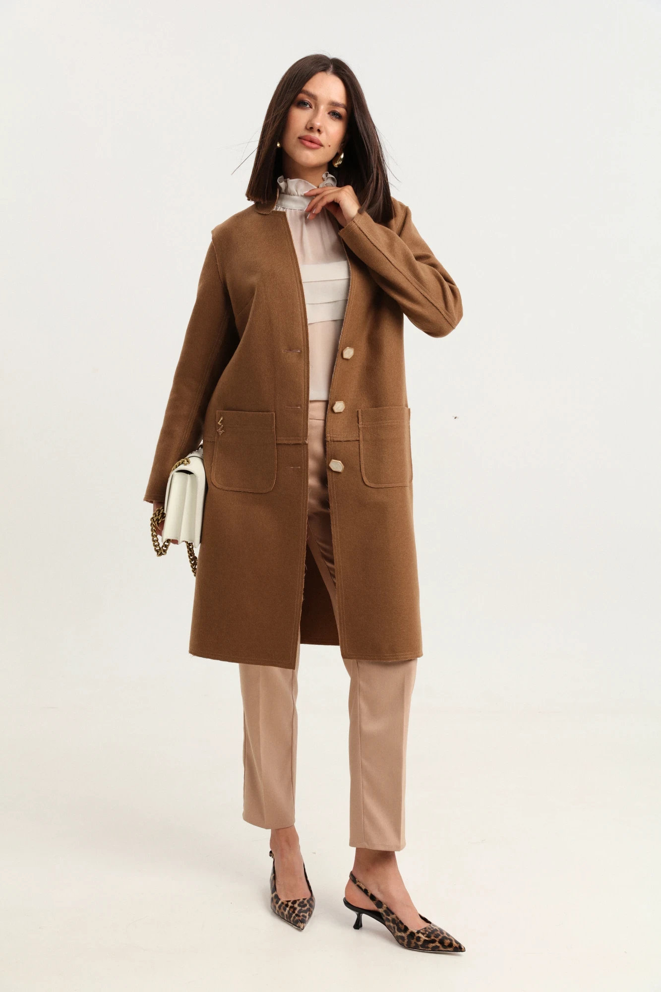 Трендовое женское облегченное пальто из двухсторонней шерстяной ткани. Пальто выполнено без подкладки, благодаря чему подойдет в качестве легкой демисезонной одежды и станет необычной альтернативой кардигану или жакету. Детали модели: прямой силуэт, слегка зауженное к низу, втачные рукава, модельный воротник-стойка, застежка на пуговицы, большие накладные карманы. Пальто сшито с оригинальным эффектом «шва наружу», благодаря чему смотрится необычно и стильно. Изделие декорировано отделочной строчкой. Фактурная ткань прекрасно дополняет лаконичный дизайн и делает модель подходящей для образов в классическом, повседневном и авангардном стиле. Рост фотомодели 175 см. Размер у фотомодели – 44