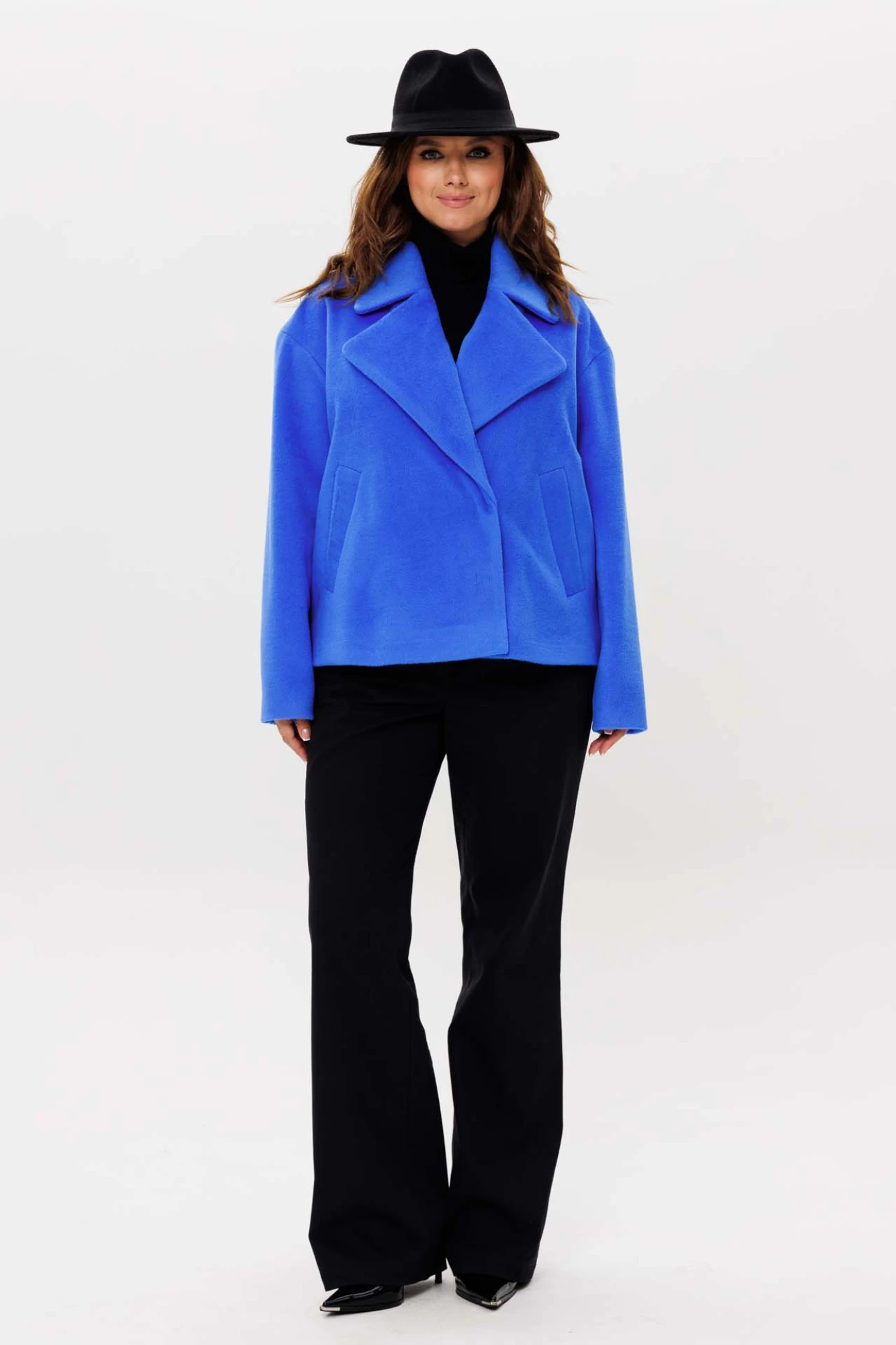 Полупальто двубортное с застежкой на магнитные кнопки, прямого силуэта выполнено из фактурной ткани. Рукав втачной, спущенное плечо. Карманы прорезные с листочкой. Воротник с отрезной стойкой. Пальто на подкладке.