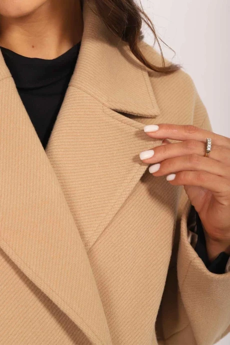 Пальто женское прямого силуэта, выполнено из пальтовой фактурной ткани. По переду нагрудные вытачки, застежка центральная двубортная на четыре прорезные петли и пуговицы, карманы прорезные с клапанами. Рукава двух шовные втачные со спущенным плечом. Центральный шов спинки заканчивается шлицей.