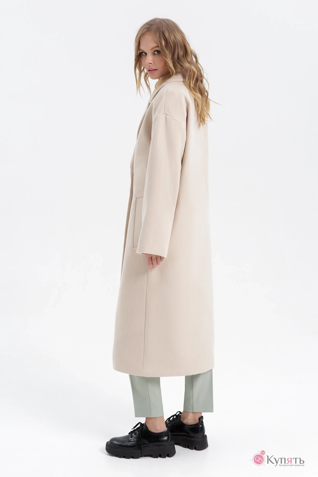 Двубортное пальто-халат свободного покроя со съемным поясом. Детали: прямой силуэт, спущенная линия плеча, пиджачный воротник, без застежки, рукава длинные, перед с прорезными карманами, пальто на подкладке