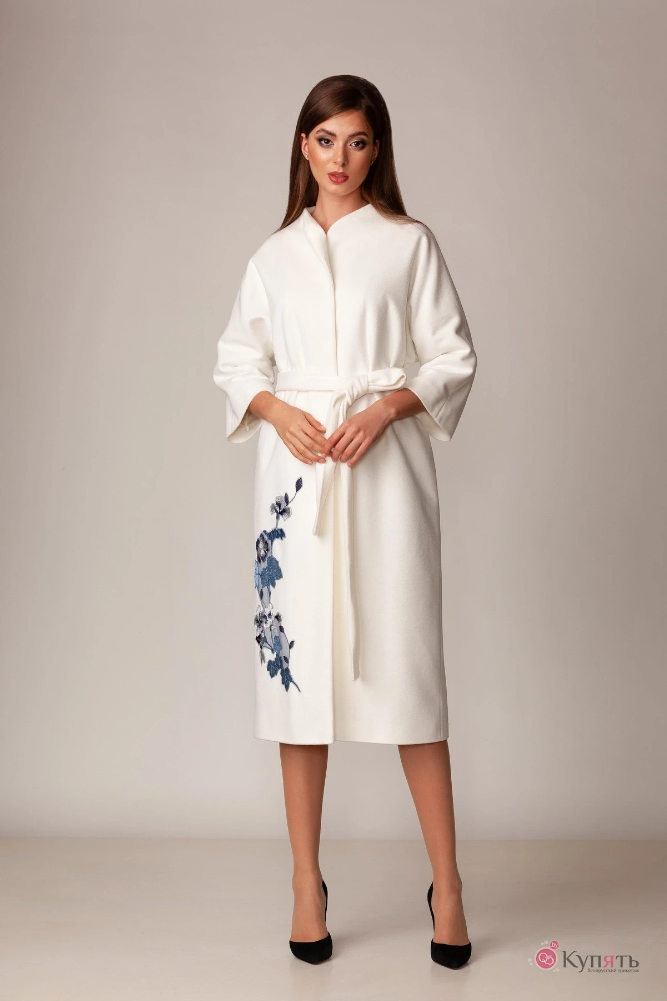 Пальто из мягкой пальтовой ткани на подкладке. Силуэт – «летучая мышь», роскошный белый цвет и потрясающий декор - все это изысканно и колоритно. Пальто застегивается на пришивные кнопки. Длина изделия-113см, длина рукава с плечом-55 см. Дополняется поясом. Цвет светло-молочный.