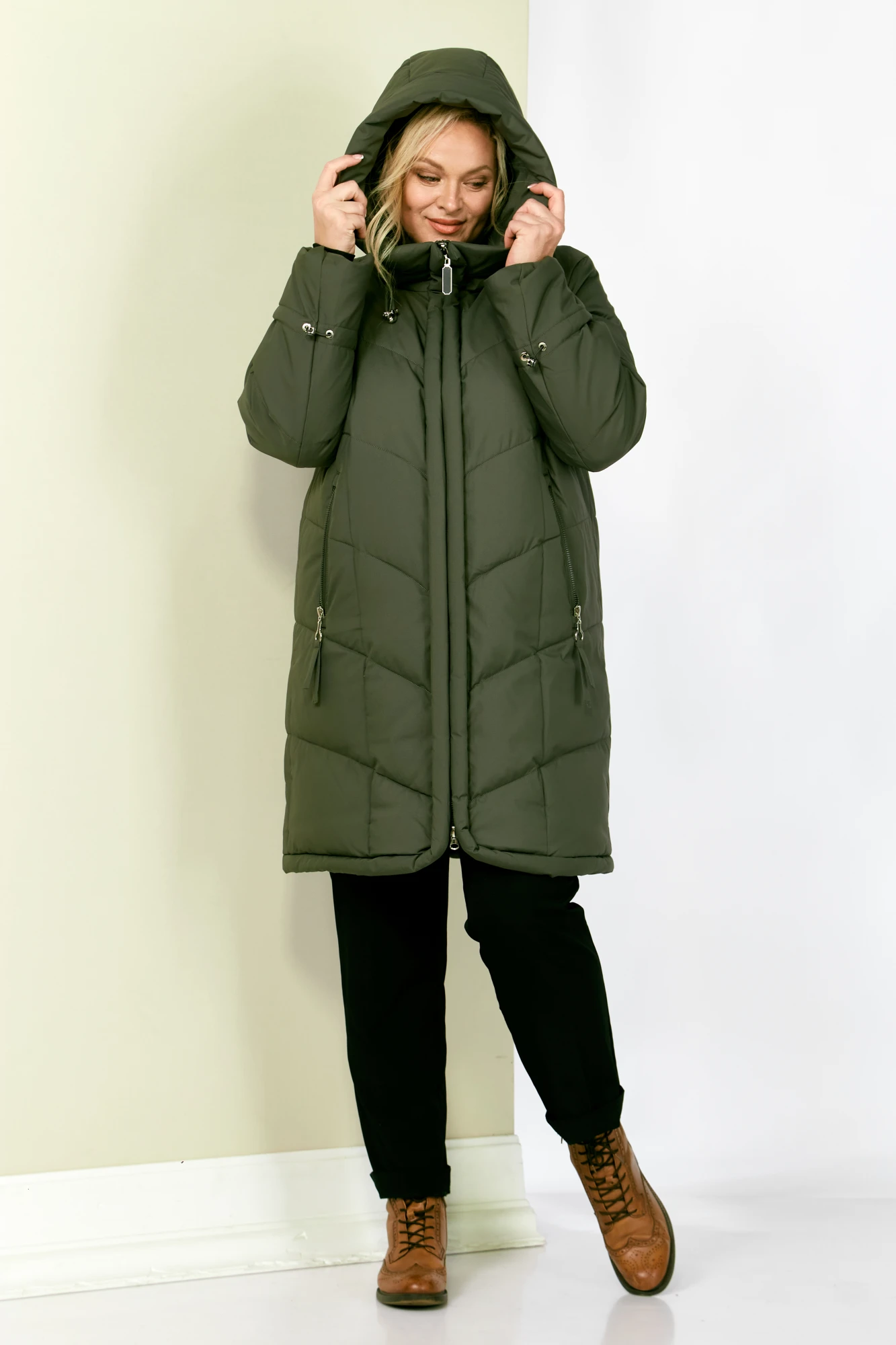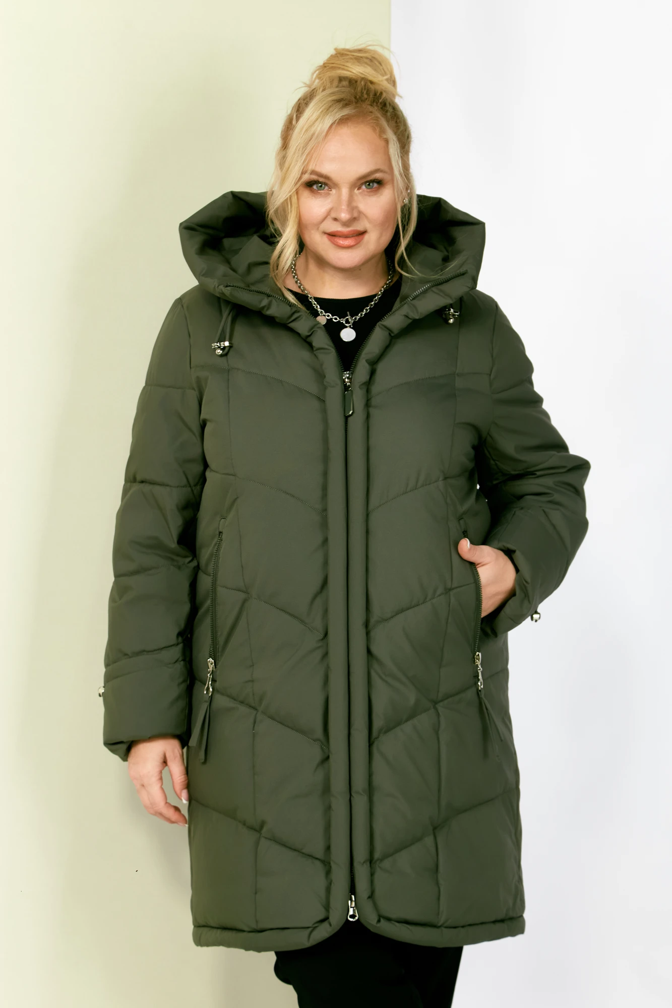 Стильное и модное женское полупальто, которое идеально подойдет для холодных дней, обеспечивая комфорт и защиту от ветра. Изделие прямого, классического стиля. Модель выполнена из курточной матовой ткани высокого качества, непромокаемая. Утеплитель «Холлофайбер» хорошо держит форму и не сбивается. По переду центральная застежка на молнии. Карманы прорезного типа с декоративным элементом. Рукав втачной. Капюшон не съемный, регулируется декоративным шнуром. По переду и спинке рельефные швы. Низ бортов с закругленным краем.