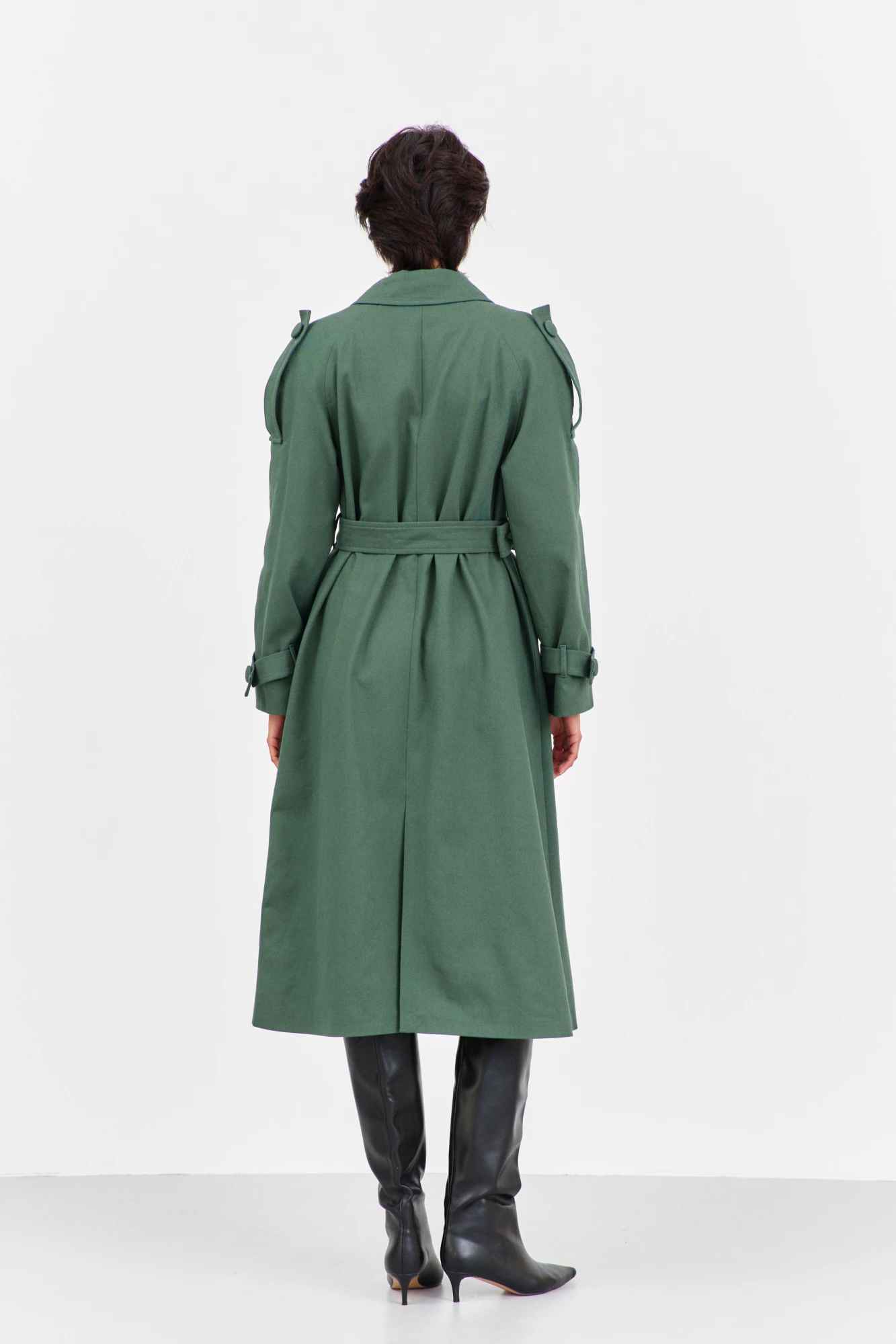 Плащ из плотного джинса в цвете зеленый мох. Характеристики: выполнен из джинсовой ткани в цвете зеленый мох, однобортная застежка на петли и пуговицы, на подкладке, функциональные карманы с листочкой, по рукавам и плечам паты на петли и пуговицы, по спинке разрез-шлица, рукава-регланы. Длина плаща 123 см, длина рукава+плечо 73 см.