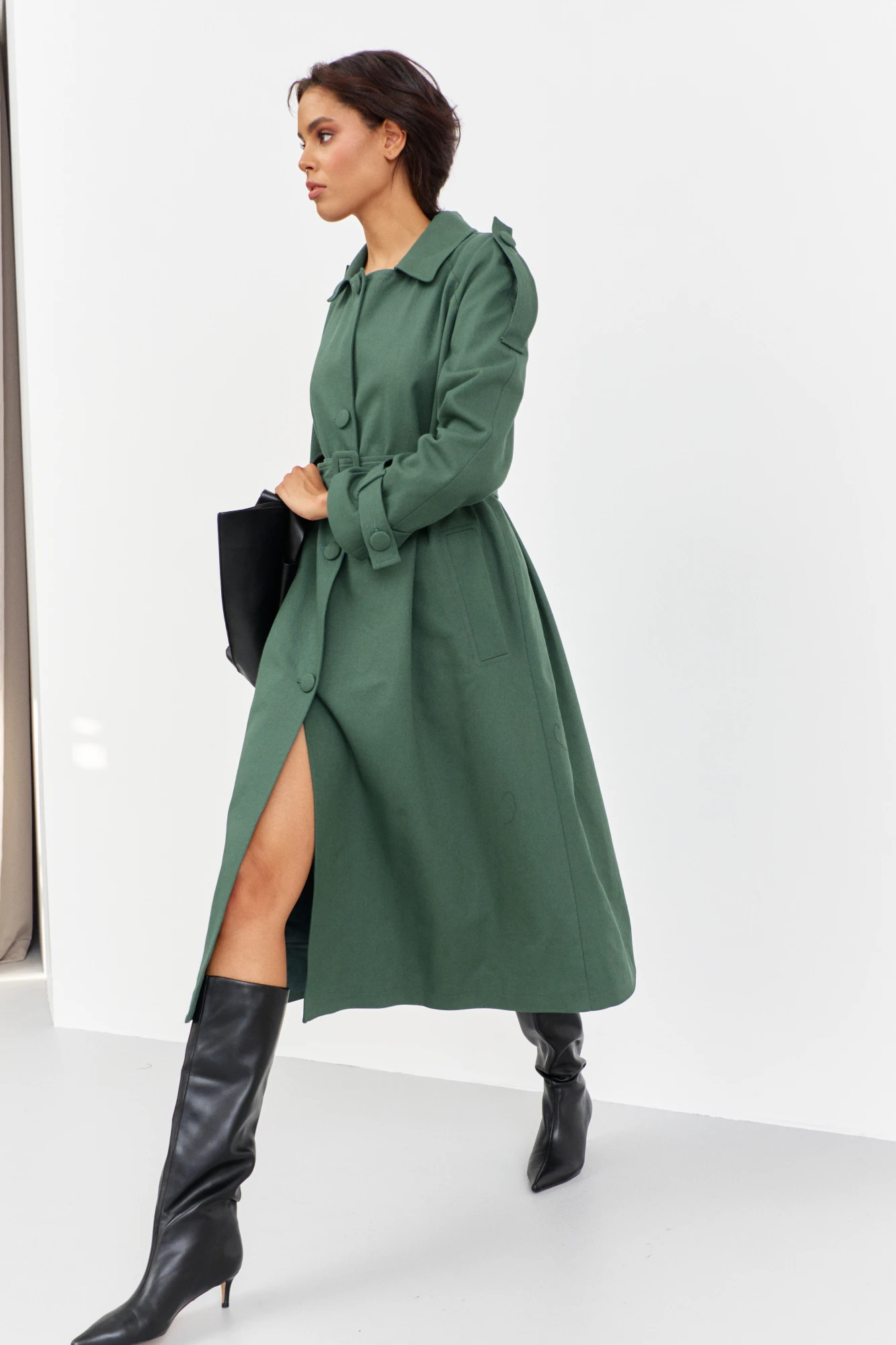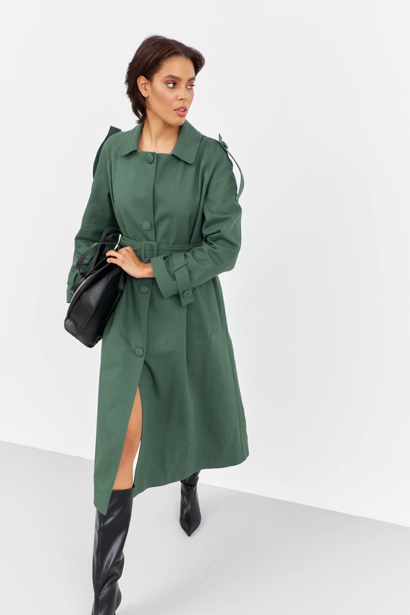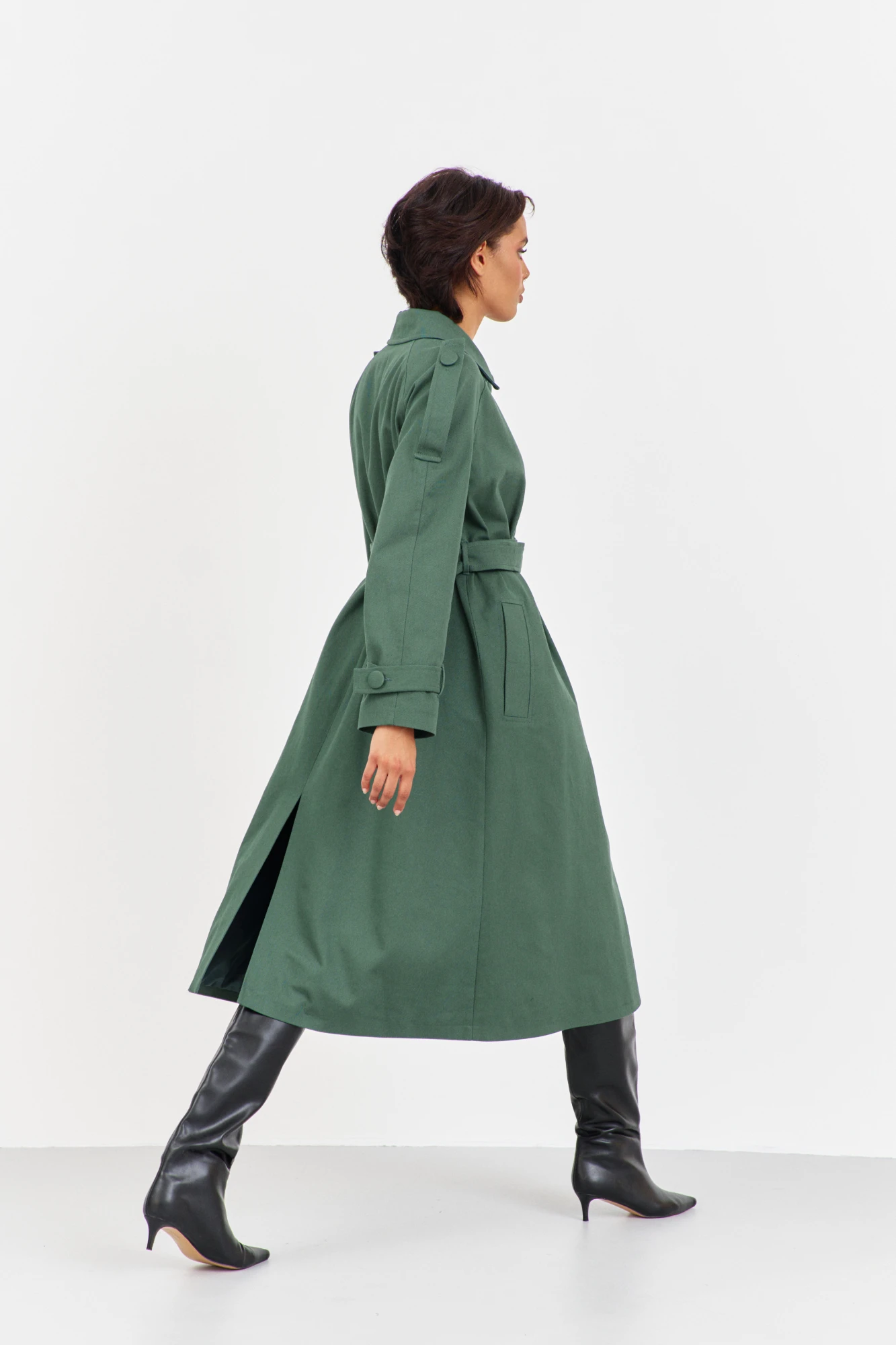 Плащ из плотного джинса в цвете зеленый мох. Характеристики: выполнен из джинсовой ткани в цвете зеленый мох, однобортная застежка на петли и пуговицы, на подкладке, функциональные карманы с листочкой, по рукавам и плечам паты на петли и пуговицы, по спинке разрез-шлица, рукава-регланы. Длина плаща 123 см, длина рукава+плечо 73 см.
