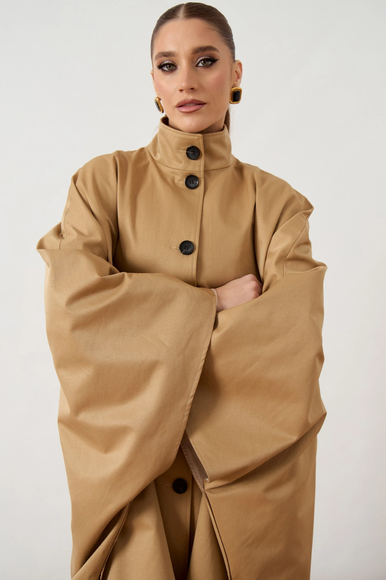 Тренч женский, свободного силуэта, из костюмно-плащевой ткани. Модель с воротником-стойкой и застежкой на петли и пуговицы. Изделие дополнено объемной отлетной кокеткой по переду и спинке, имитирующей кейп. Рукав цельнокроеный, переходящий в широкую форму, с разрезами в нижней части для свободы движения. Перед с вертикальными прорезными карманами в швах. Изделие на подкладке.
