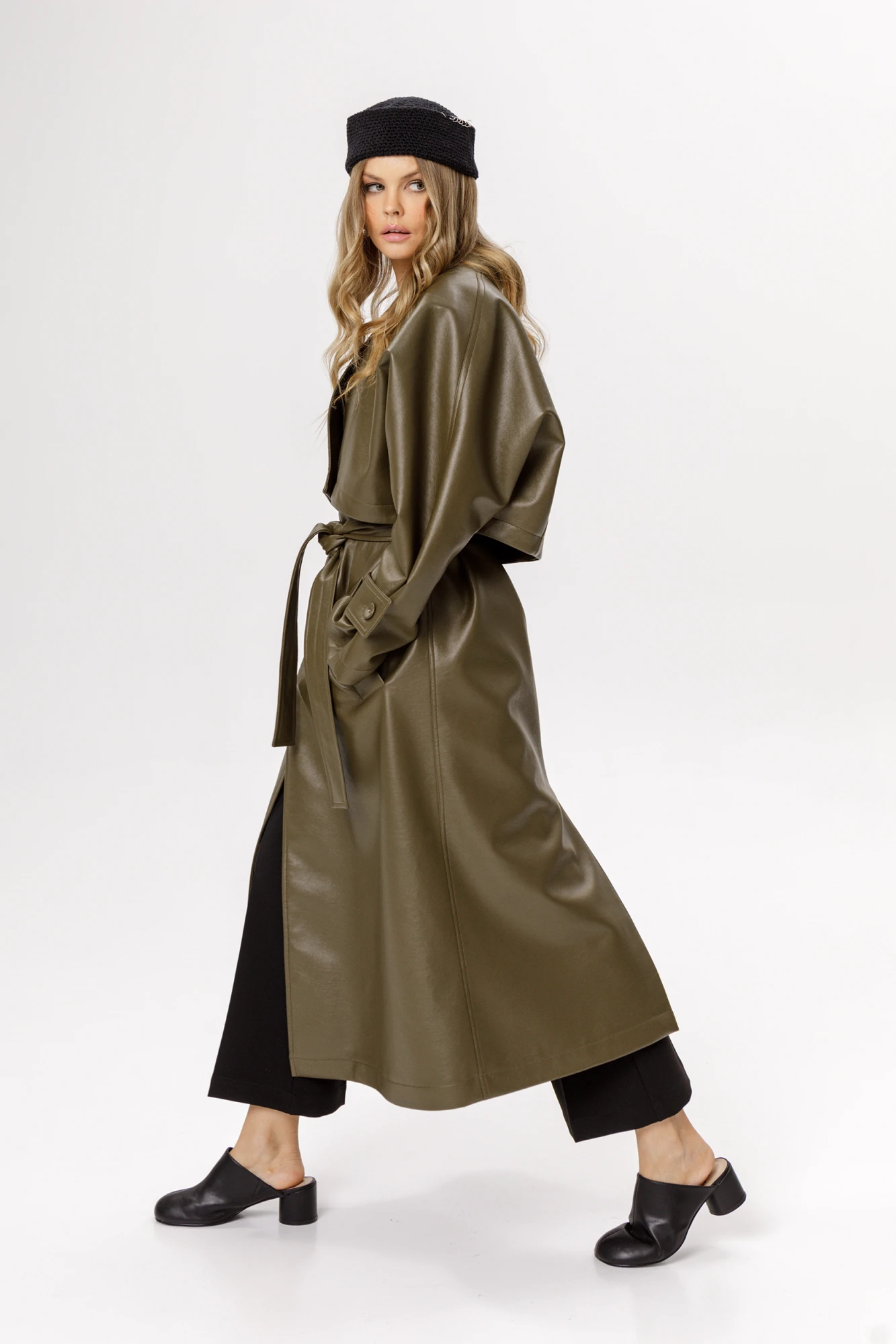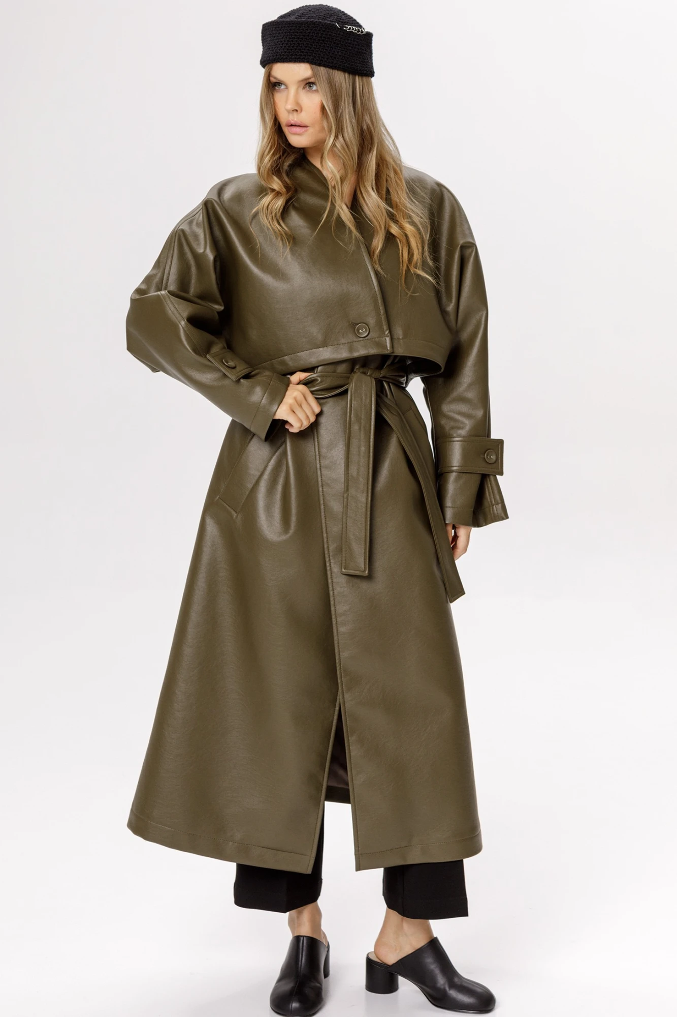 Свободный универсальный тренч-трансформер состоящий из жилета и верхней укороченной куртки из экокожи.