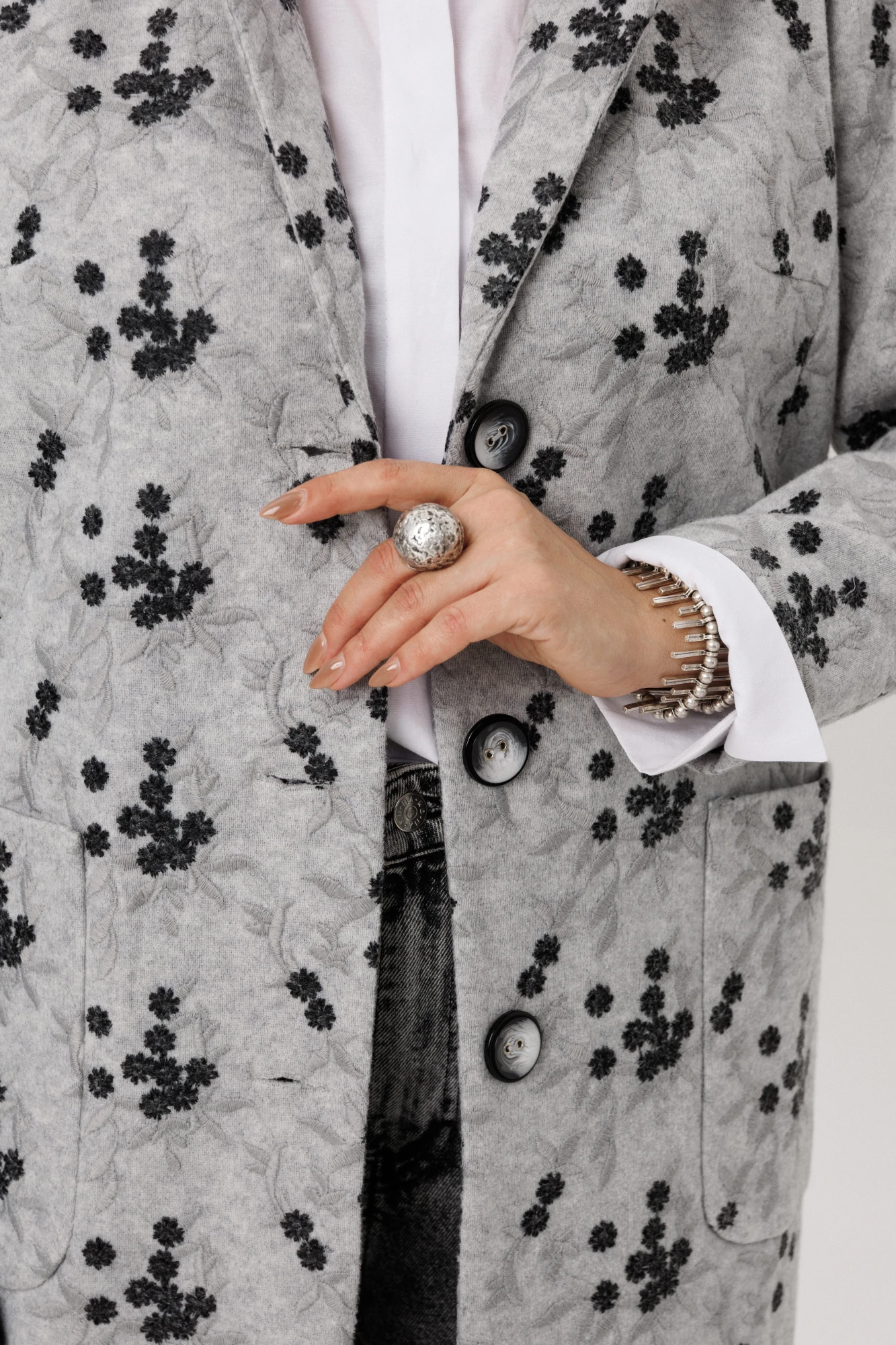 Этот уютный жакет повседневного кроя, выполненный в спокойном оттенке «серый шиповник» - создан для комфорта. Его свободный силуэт с втачными рукавами и аккуратной застежкой на пуговицы обеспечивает идеальную посадку.