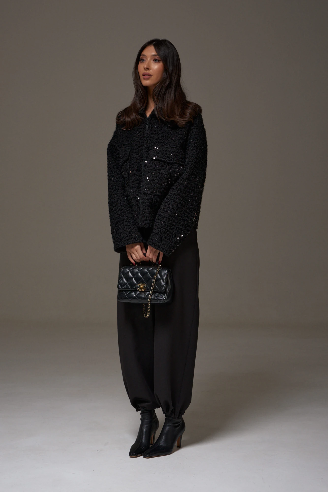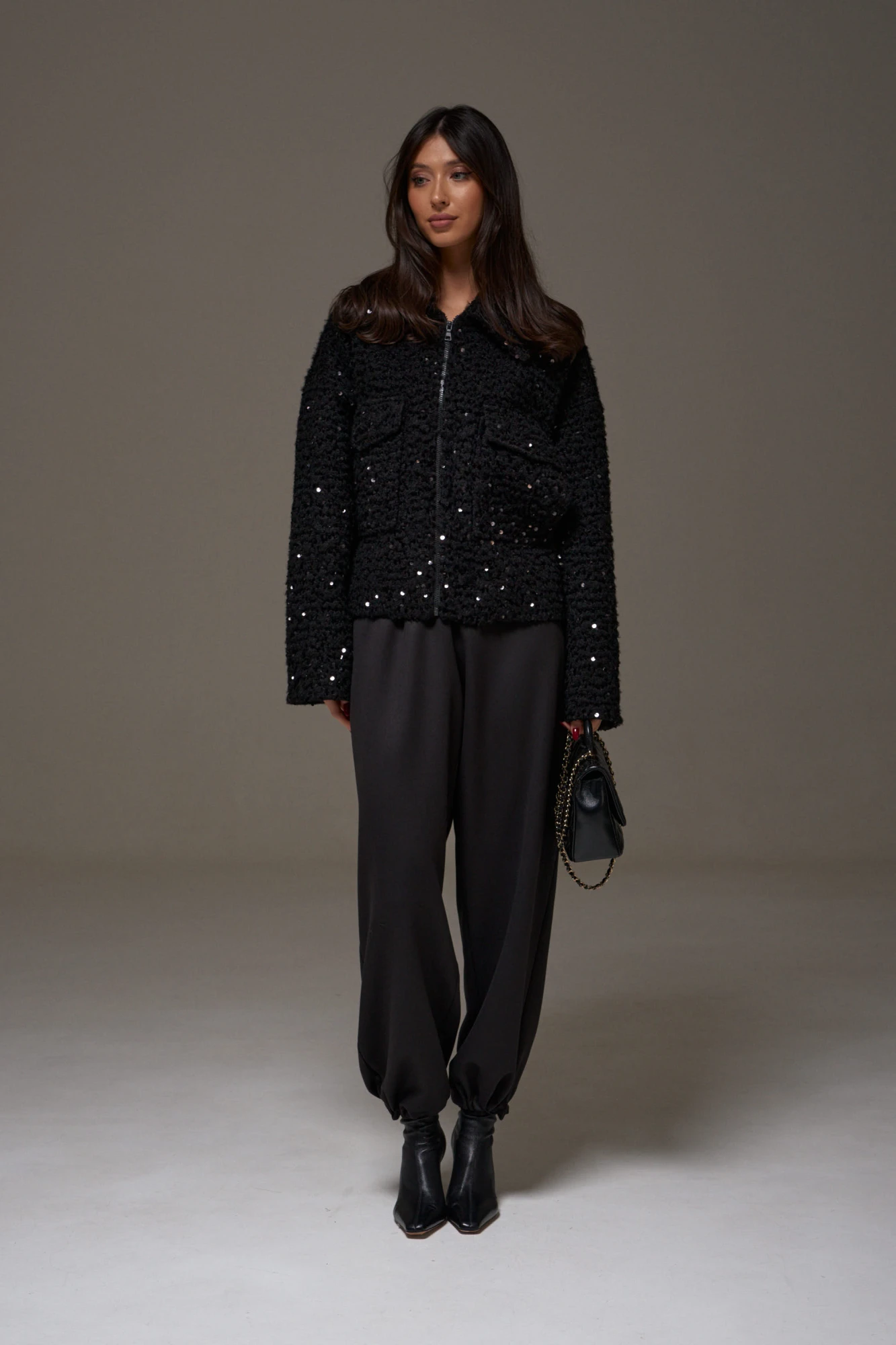 Жакет прямого свободного кроя. Выполнен из фактурной плотной (пальтовой) ткани чёрного цвета с пайетками. С подкладкой. Воротник отложной. Рукав втачной, спущенный. Застёжка центральная - молния. По переду накладные карманы с клапаном (с боковым входом). Спинка цельнокроеная. Длина рукава от линии втачивания 54 см. Длина спинки 59 см