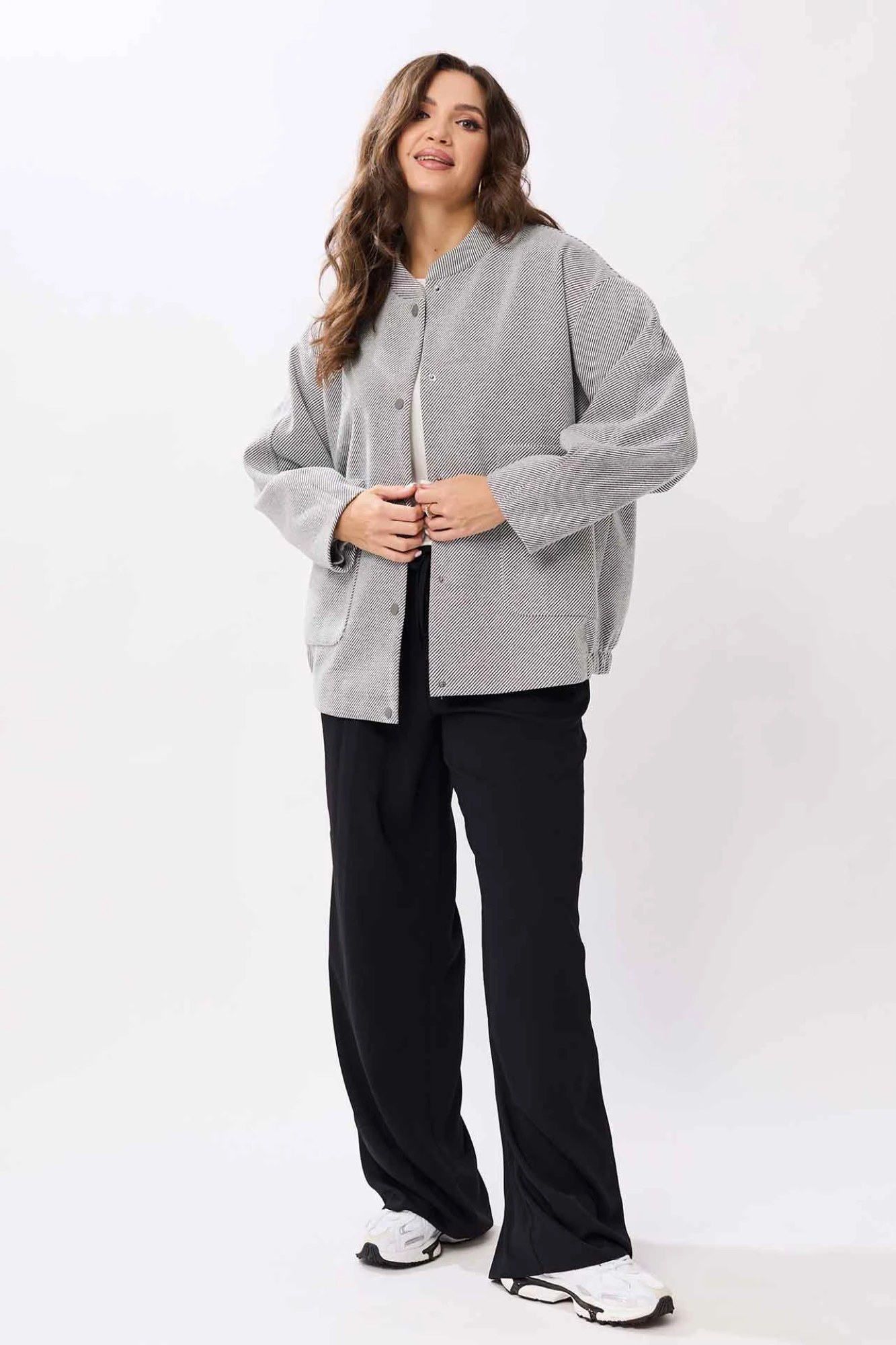 Женский жакет выполнен из мягкой, пальтовой ткани что придаёт изделию универсальность и комфорт. Воротник-стойка. Застёжка: на пробивные кнопки. Рукава со спущенной проймой втачной, двухшовный. В изделии предусмотрены накладные карманы на передней части. Эластичная резинка по нижнему краю жакета создаёт лёгкую сборку, что подчёркивает силуэт и обеспечивает дополнительное удобство. Жакет на подкладке.