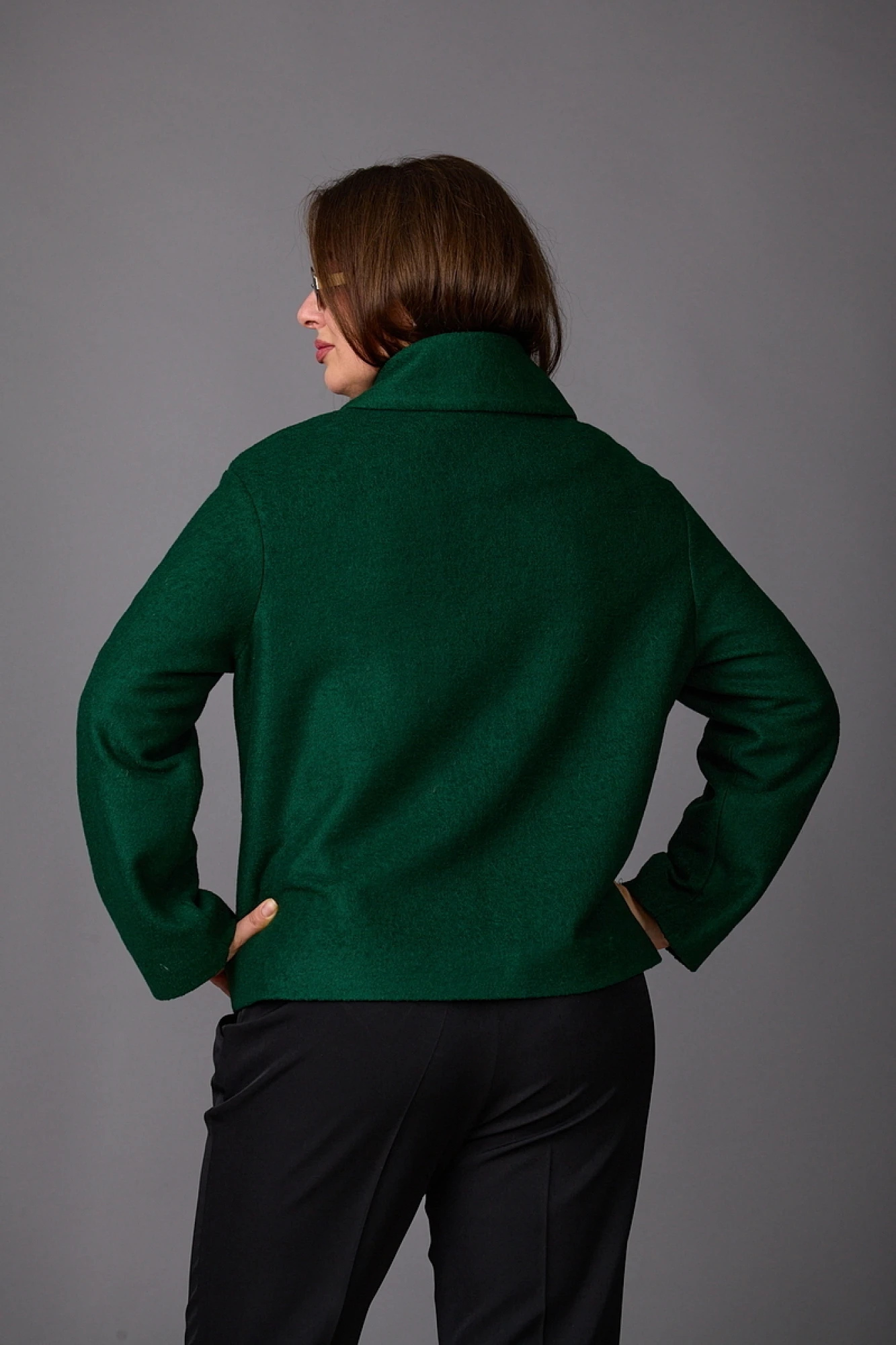 Жакет на подкладке из пальтовой ткани. Силуэт прямой, по переду нагрудные вытачки и накладные карманы с клапанами округлой формы. Пройма спущена, рукава узкие. Воротник с закругленными углами с притачной стойкой. Застегивается на 4 пуговицы.