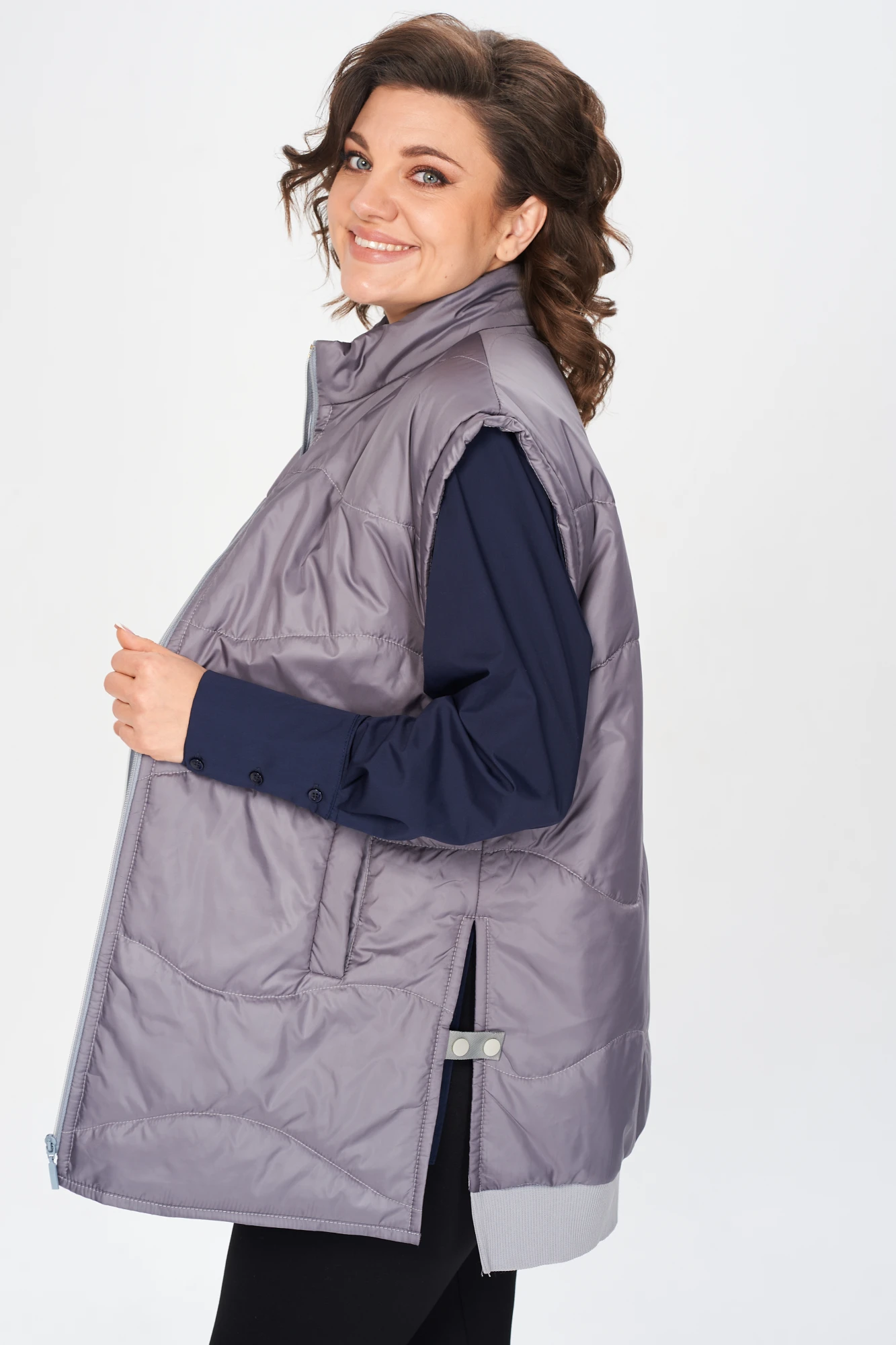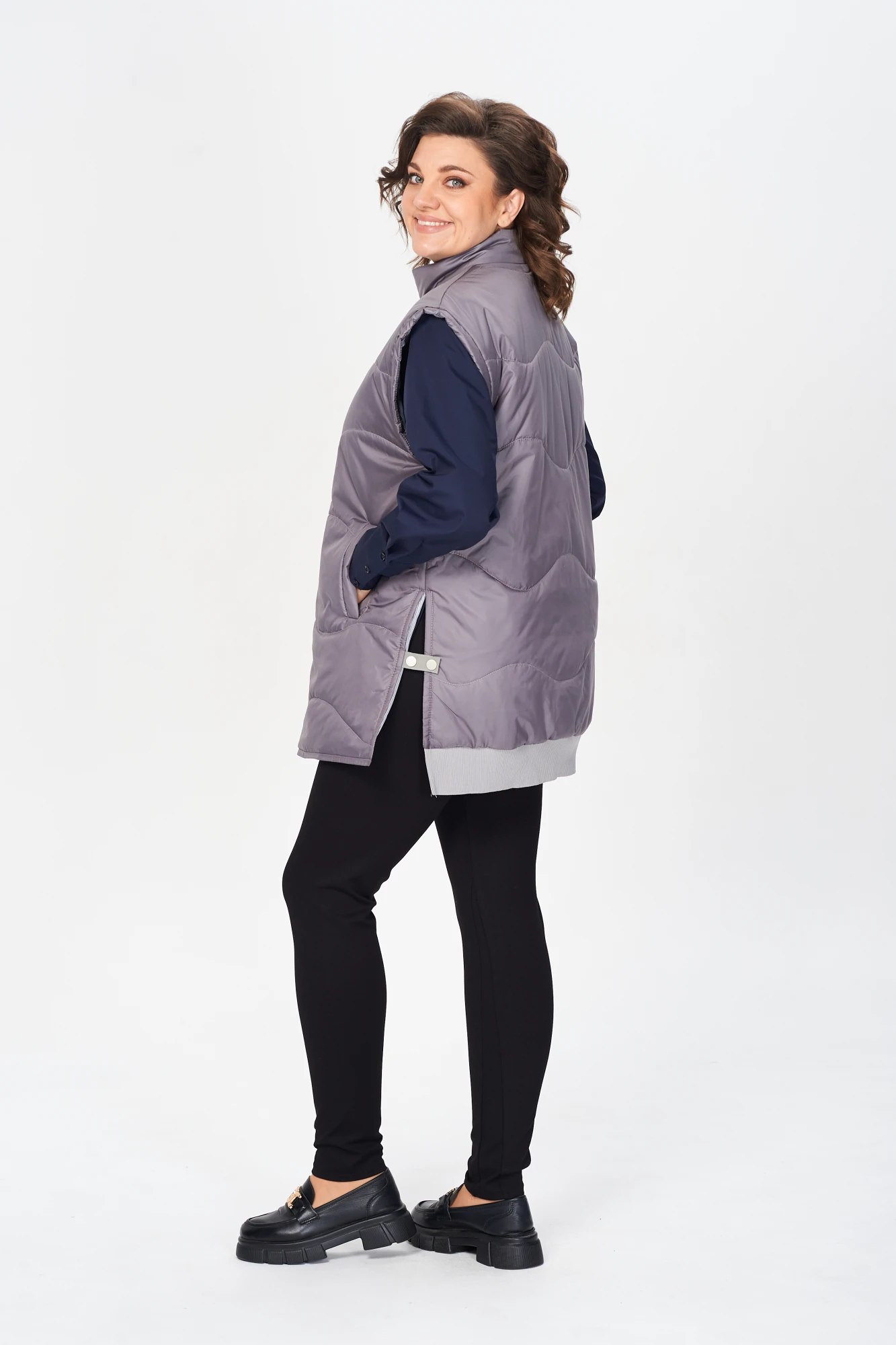 Жилетка свободного силуэта, прямого кроя, удлиненная, с декоративной стежкой. Воротник стойка. Центральная застежка молния. На переде прорезные карманы с листочками. Спинка заканчивается манжетом из довяза. Спущенная линия плеча, по пройме узкие манжеты из плащевки с утеплителем. По бокам разрезы, по середине разреза тесьма с застежкой на 2 кнопки, которые регулируют ширину изделия по бедрам. Длина плеча-18см, длина переда-82см, длина по спинке-84см. Длина разреза-30см.