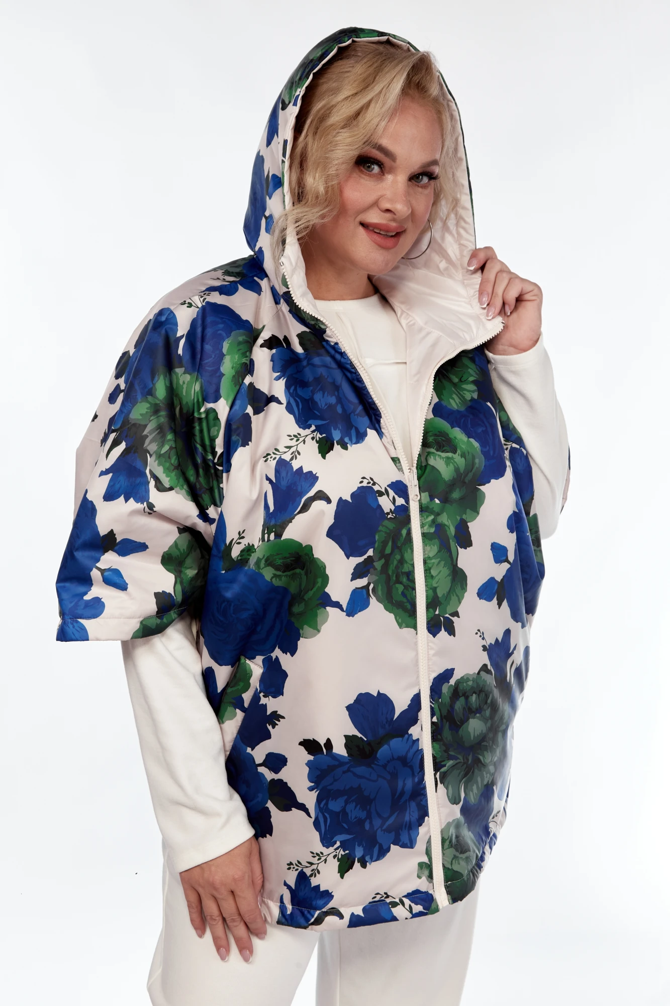 Пончо 2-ух стороннее с центральной бортовой застежкой "молния". Черная сторона: по переду и спинке выполнена горизонтальная стежка. Перед с накладными карманами "кенгуру". Вторая сторона: перед с боковыми прорезными карманами "с листочкой". По боковым швам застежка на три кнопки образует разрезы округлой формы. Воротник-капюшон. По краю отделочная строчка на 2,5 см.