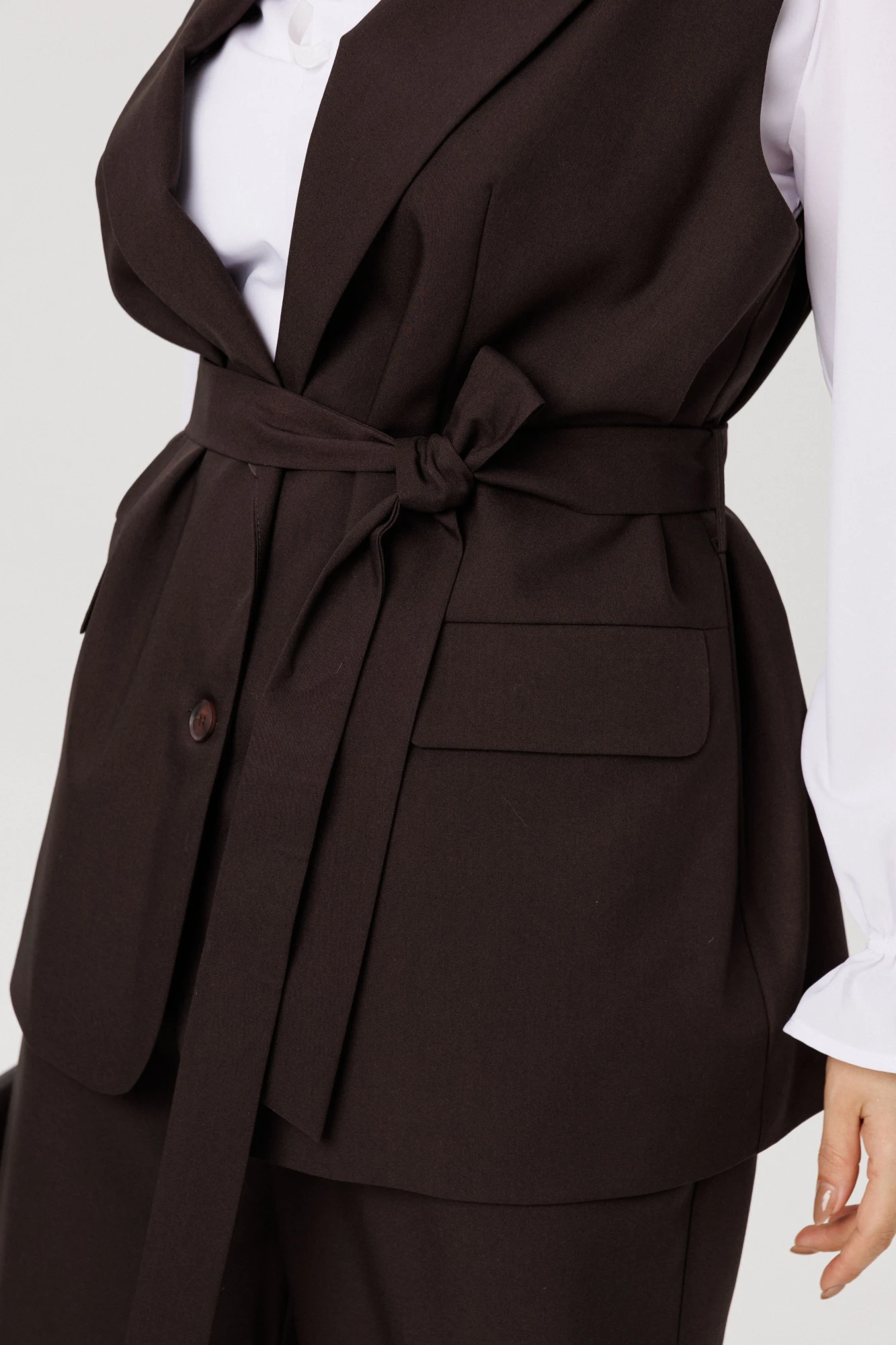 Входящий в комплект пояс эффектно подчеркивает талию, создавая идеальный силуэт и добавляя нотку женственности. Жилет прекрасно сочетается как с классическими брюками, так и с романтичными юбками, а также выглядит потрясающе на платьях. Он станет ярким акцентом в вашем образе, подчеркивая ваш безупречный вкус и уникальную индивидуальность.