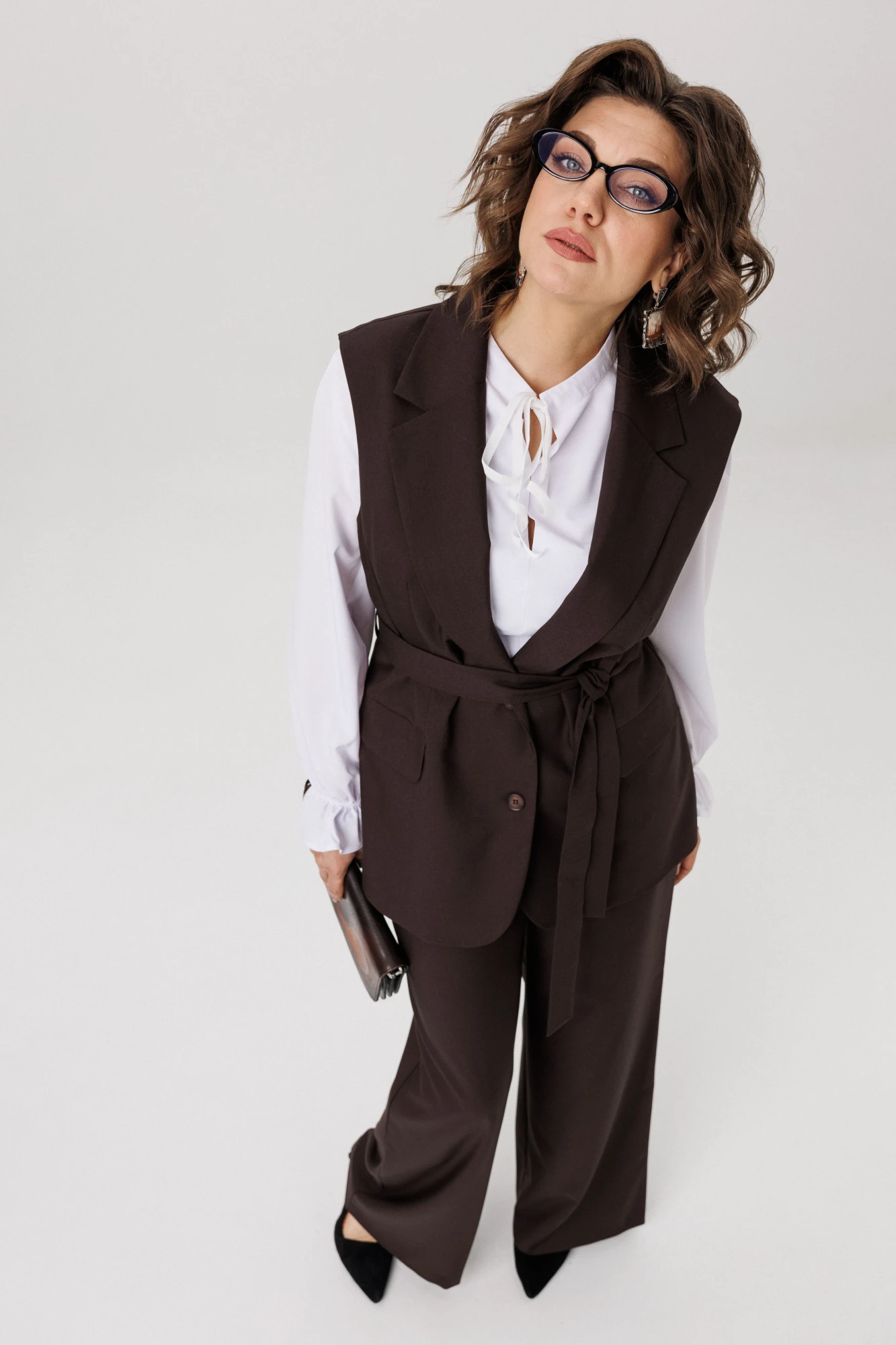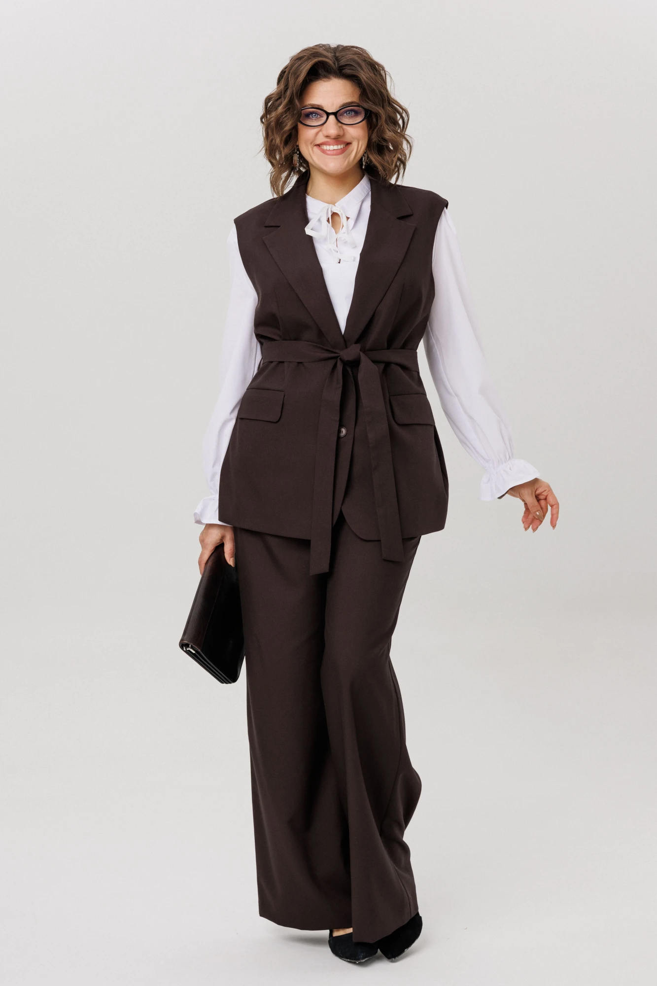 На модели в жилете цвета «грозовая туча» брюки 1702 и топ 767. Также можно купить жилет и брюки в костюме 1501.