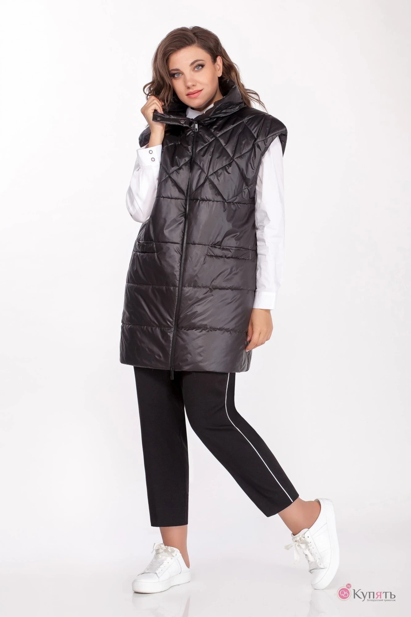 Жилет женский повседневный из плащевой ткани, прямого силуэта, на утеплителе ISO SOFT.Перед с двухсторонней застежкой донизу на отрезной кокетке, отстроченной ромбиком. В области талии расположены карманы с листочкой. Горловина с воротником стойкой, застегивающийся на 2 кнопки. Спинка на кокетке, нижняя часть со средним швом.