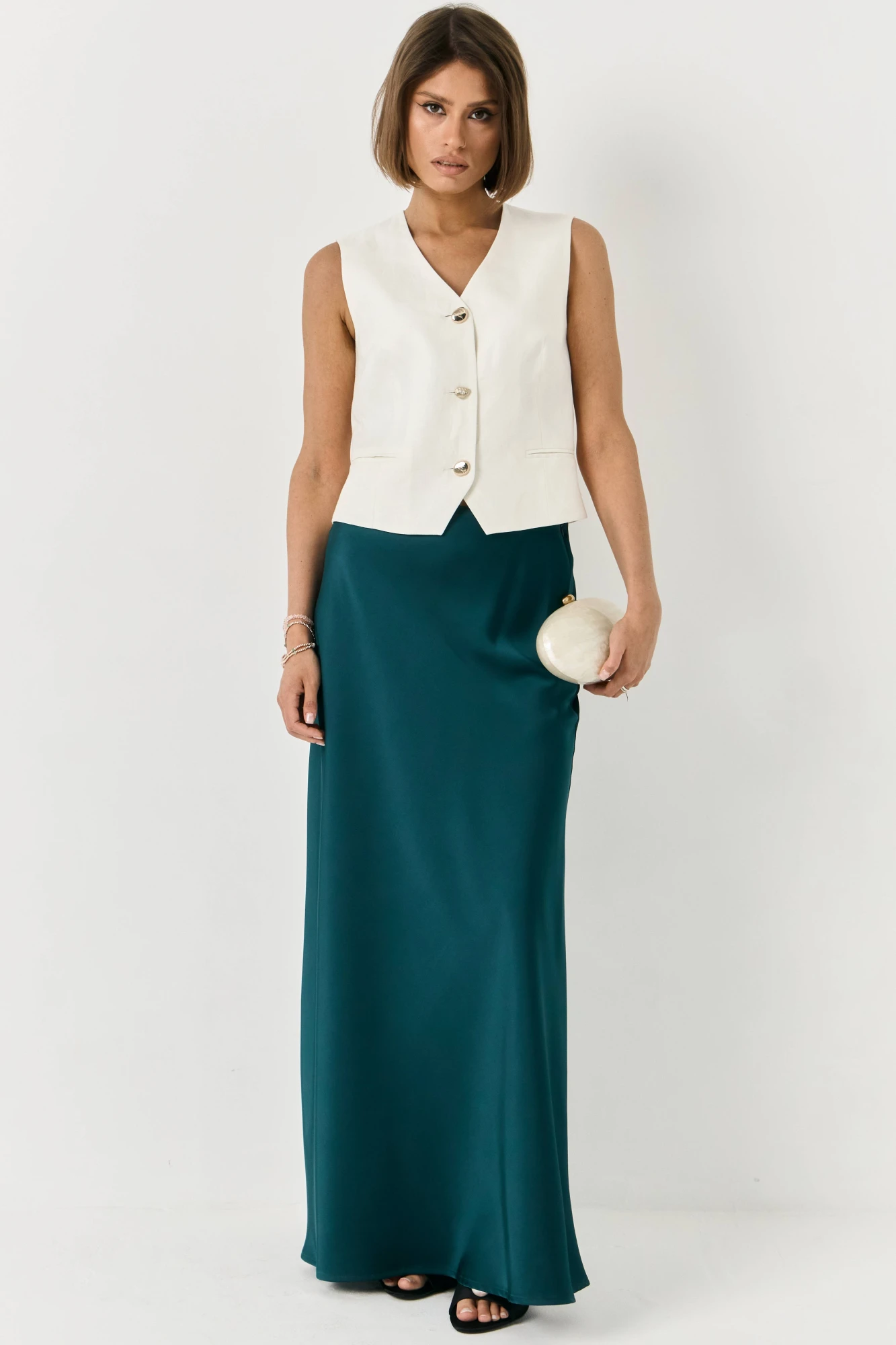 Жилет полуприлегающего силуэта, выполнен из льна. По переду застежка на небольшие декоративные пуговицы. Жилетка с прорезными нефункциональными карманами. По переду изделия небольшие выточки.