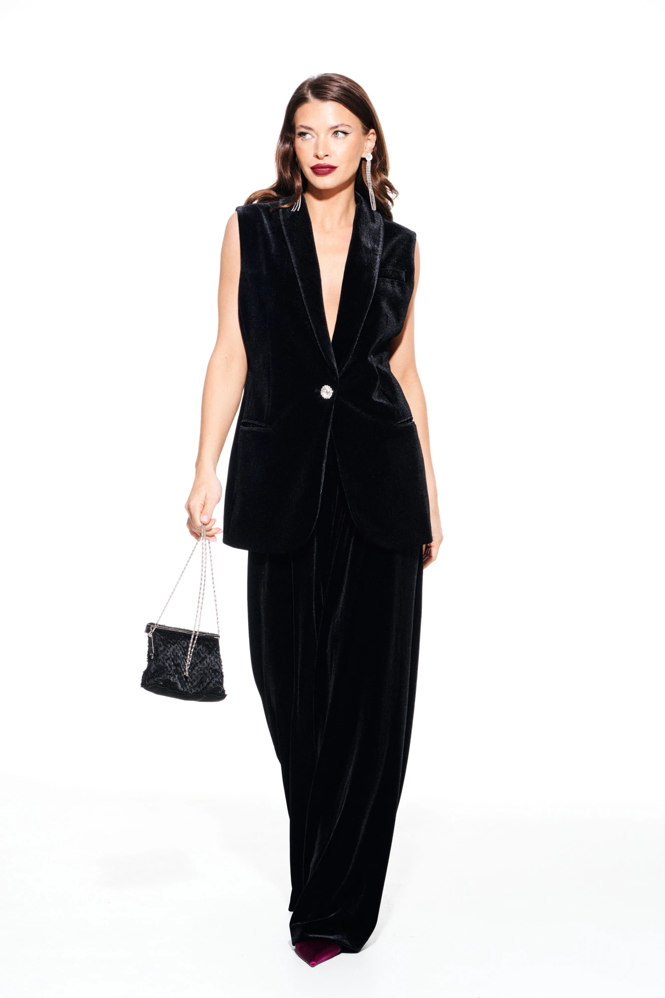 Жилет из бархата на трикотажной основе, прямого силуэта, однобортный, с центральной застежкой на 1 петлю и 1 пуговицу, на подкладке. Детали переда с талиевыми вытачками, отрезными бочками и прорезными карманами в рамку. На левой полочке нагрудный карман с листочкой. Спинка со средним швом и талиевыми вытачками. Воротник – шалевый с фигурным краем.