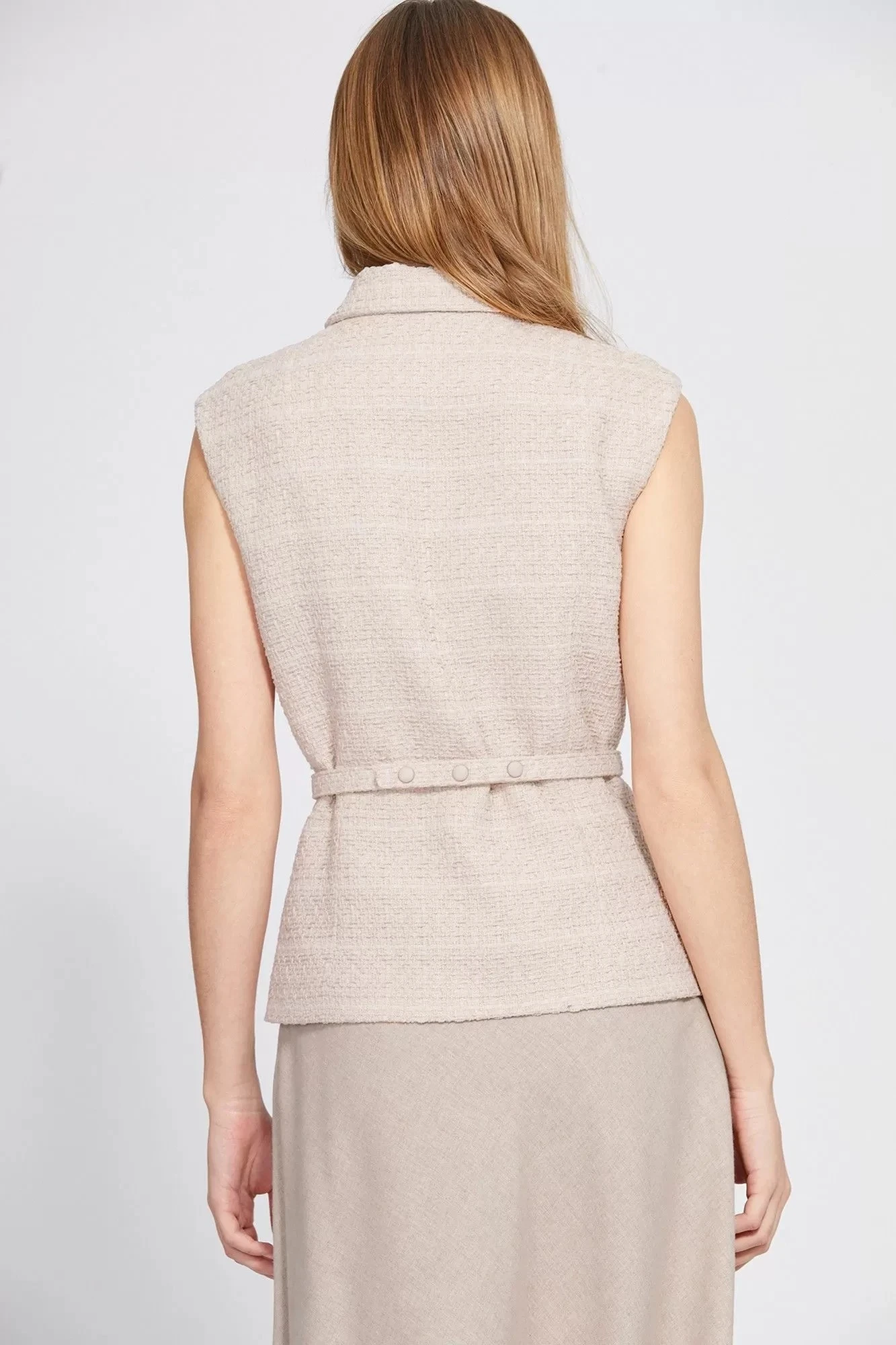 Жилет выполнен из твида. Жилет полуприлегающего силуэта, длиной выше линии бедер. Спереди прорезные карманы с клапанами. Застежка спереди центральная бортовая на пуговицы. Жилет на притачной по низу подкладке. В комплект входит ремень из основной ткани, застегивающийся сзади на 3 пробивные кнопки.