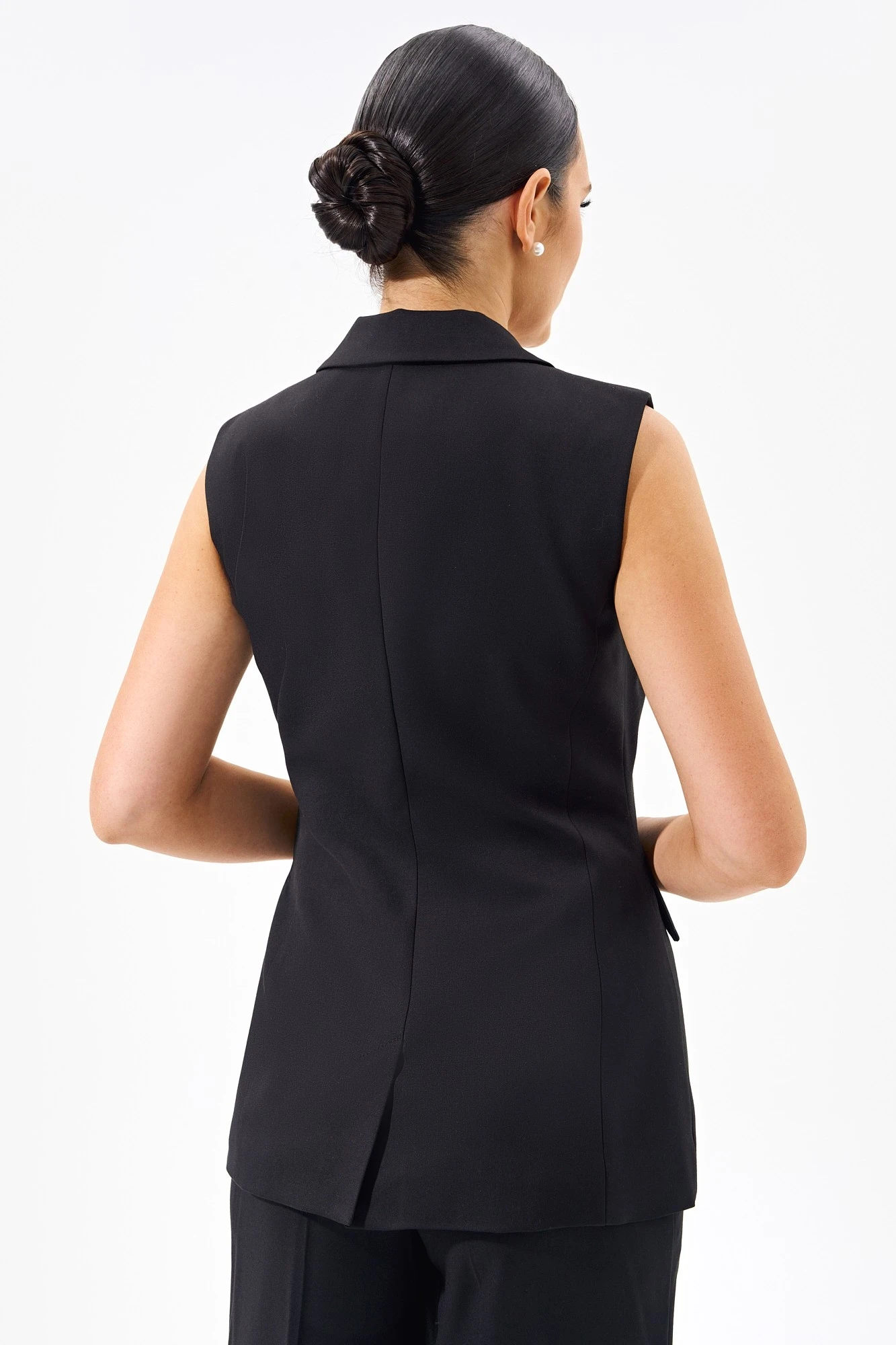 Женский деловой жилет выполнен из костюмной ткани высокого качества. Жилет классический двубортный полуприлегающего силуэта на подкладке с функциональными прорезными карманами по переду, воротником пиджачного типа и застежкой на петли и пуговицы.