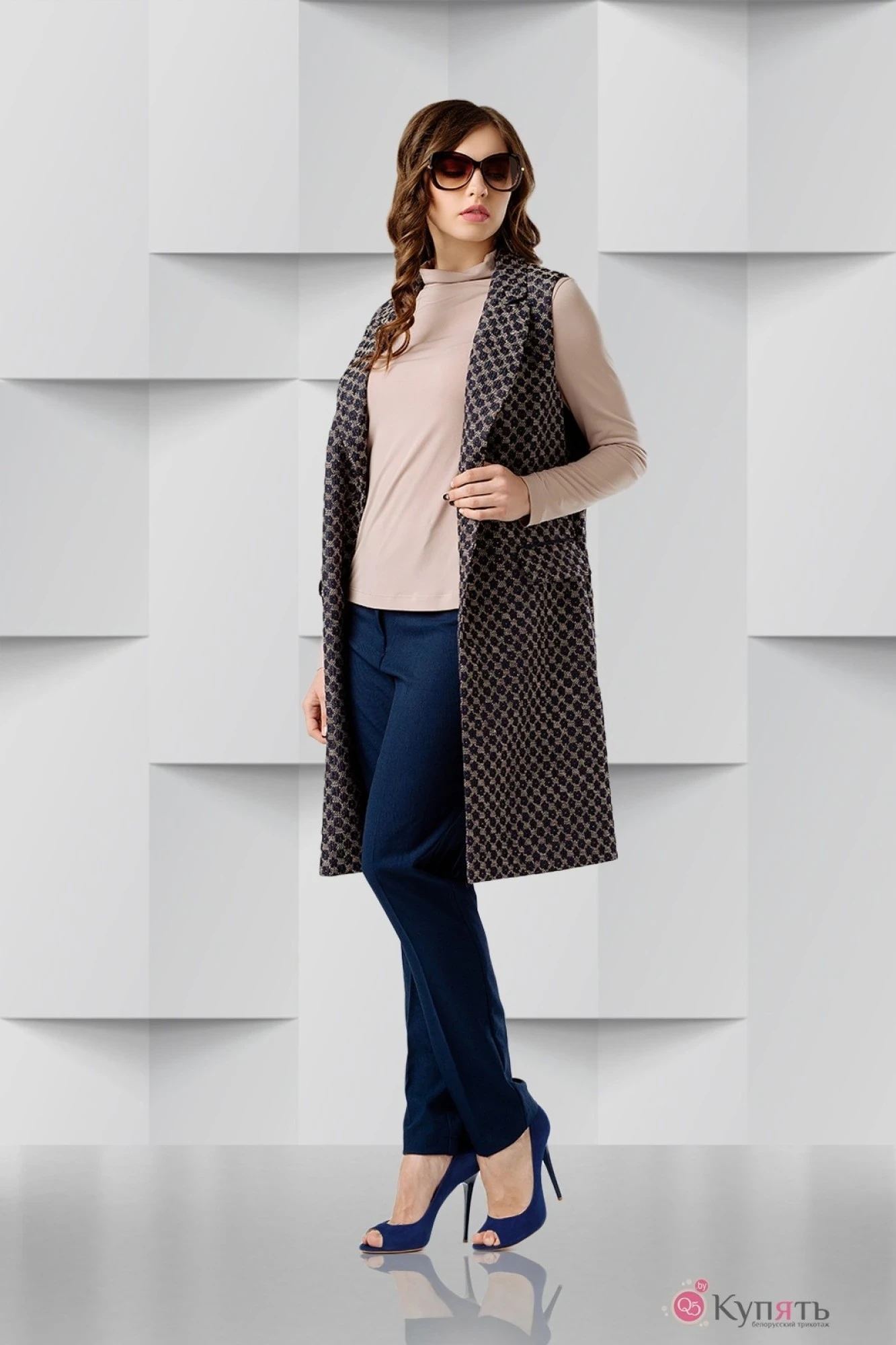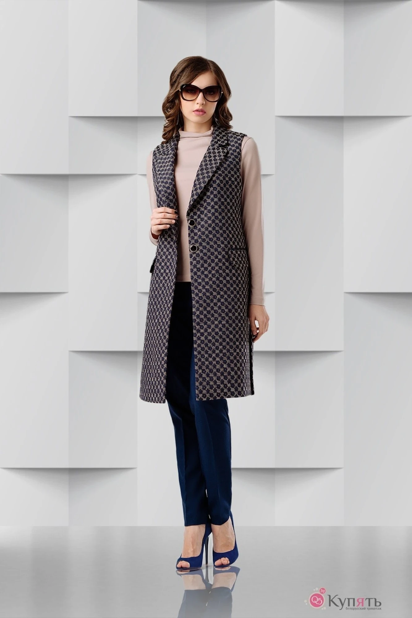 Жилет полуприлегающего силуэта с прорезными карманами клапаном и обтачками, воротником и лацканами, по боковым швам разрезы. Застёжка на две петли-пуговицы. Жилет на подкладке.