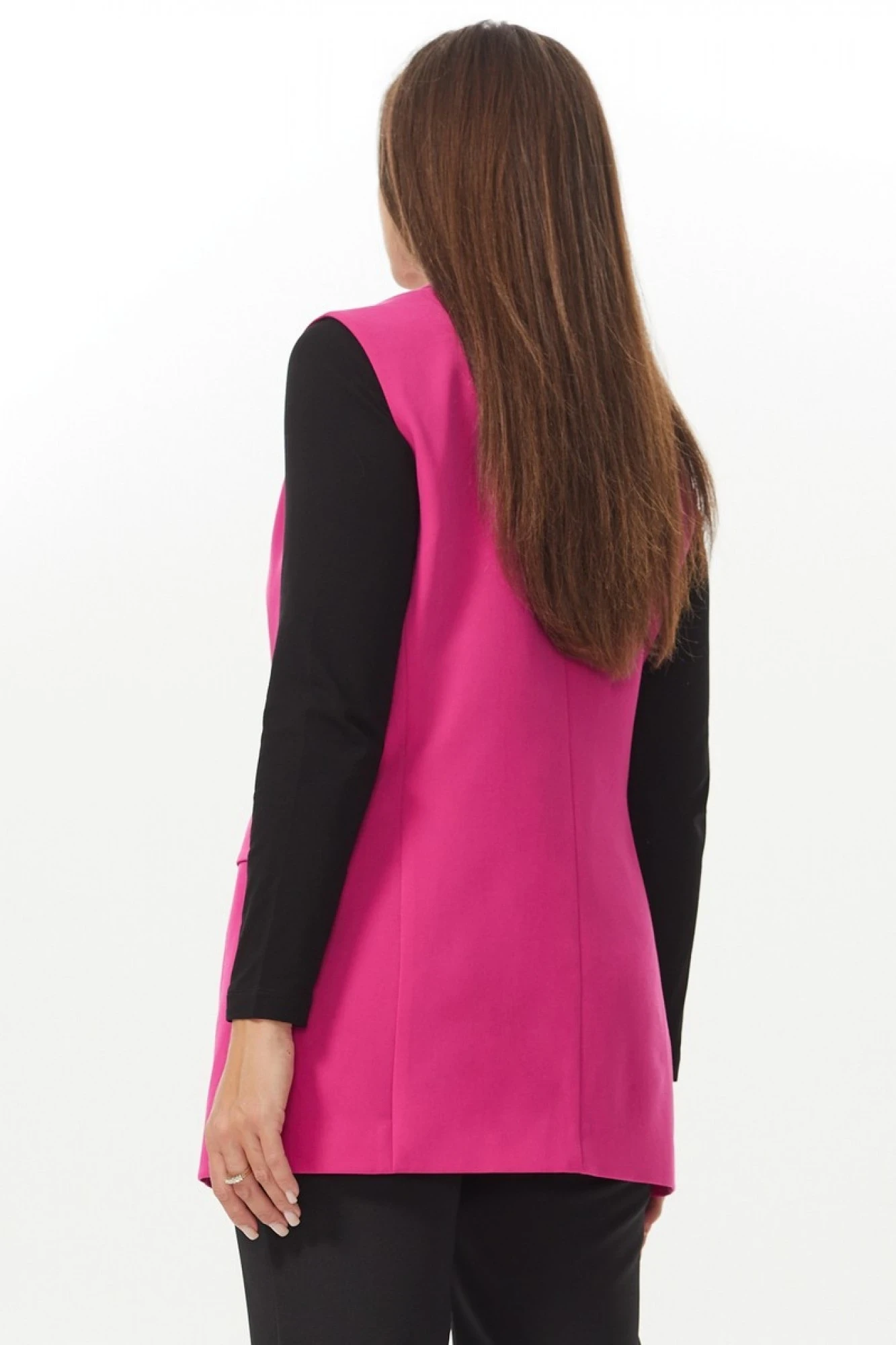 Жилет полуприлегающего силуэта с воротником пиджачного типа и однобортной застежкой на две петли и пуговицы. Полочка с вертикальными вытачками и функциональными прорезными карманами с клапаном. Спинка со средним швом. Жакет на подкладке.