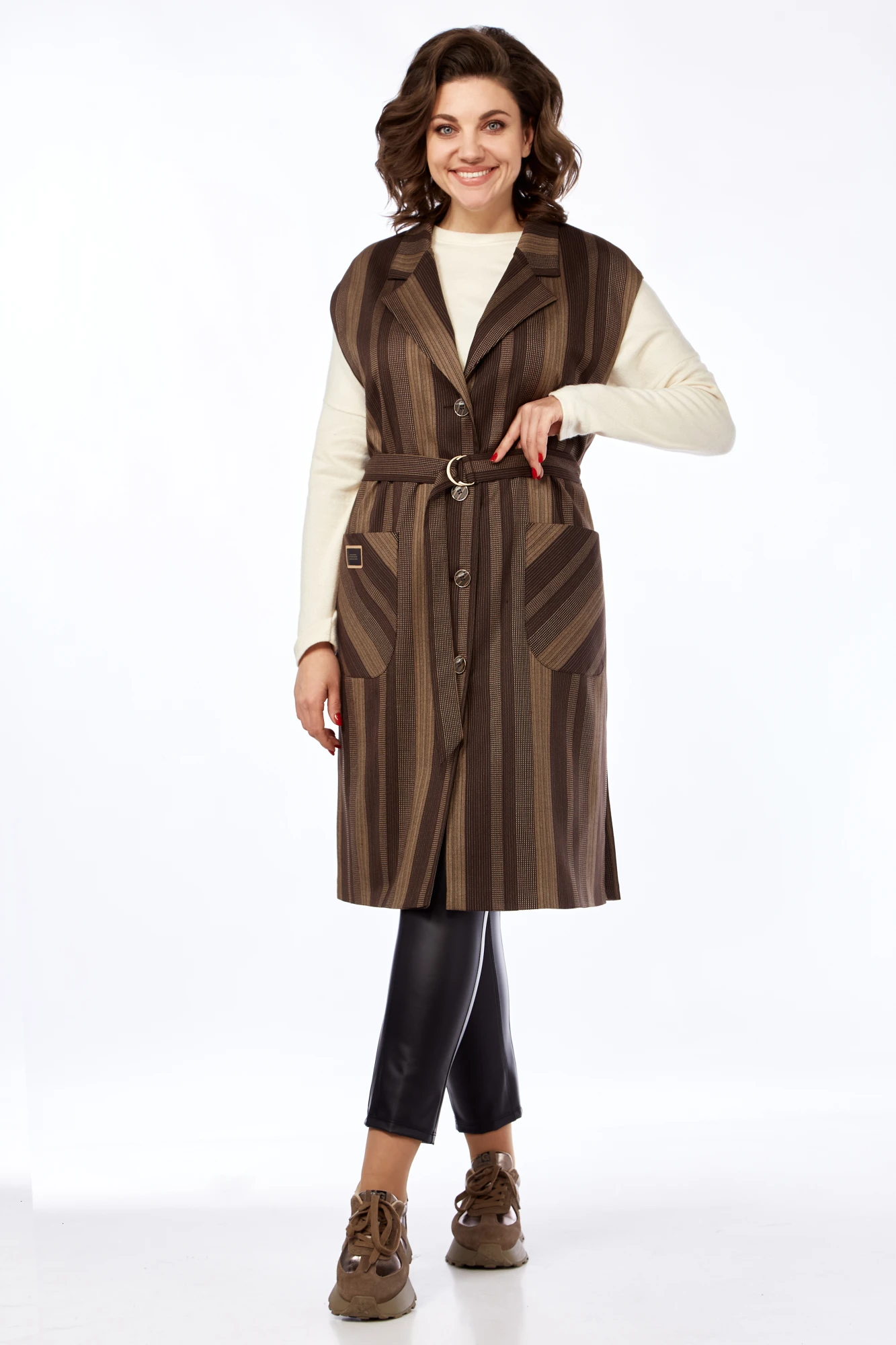 Жилет женский прямого силуэта, удлиненный. Жилет с пиджачным воротником и центральной застежкой на 5 петель и пуговиц. Перед жилета с накладными карманами. Спинка со средним швом. Разрезы в боковых швах. В комплект входит пояс на пряжке.