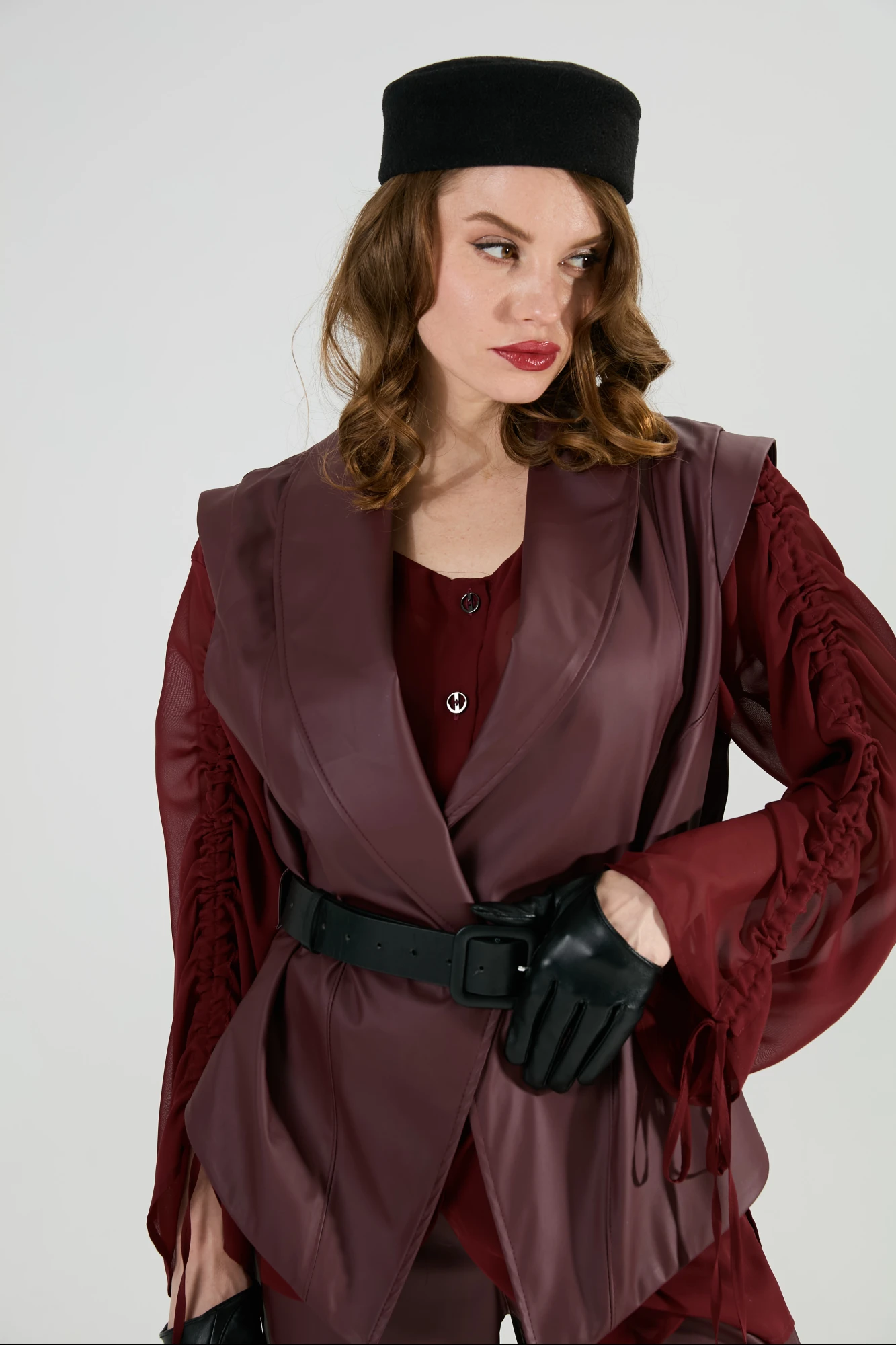Жилет удлиненный свободного прямого силуэта, воротник пиджачного типа. Линия низа по переду и спинке фигурная ассиметричная. Короткий рукав-крылышко. Талия фиксируется съемным ремнем из экокожи, для которого в боковых швах оформлены шлевки. Ремень идёт в комплекте к изделию.