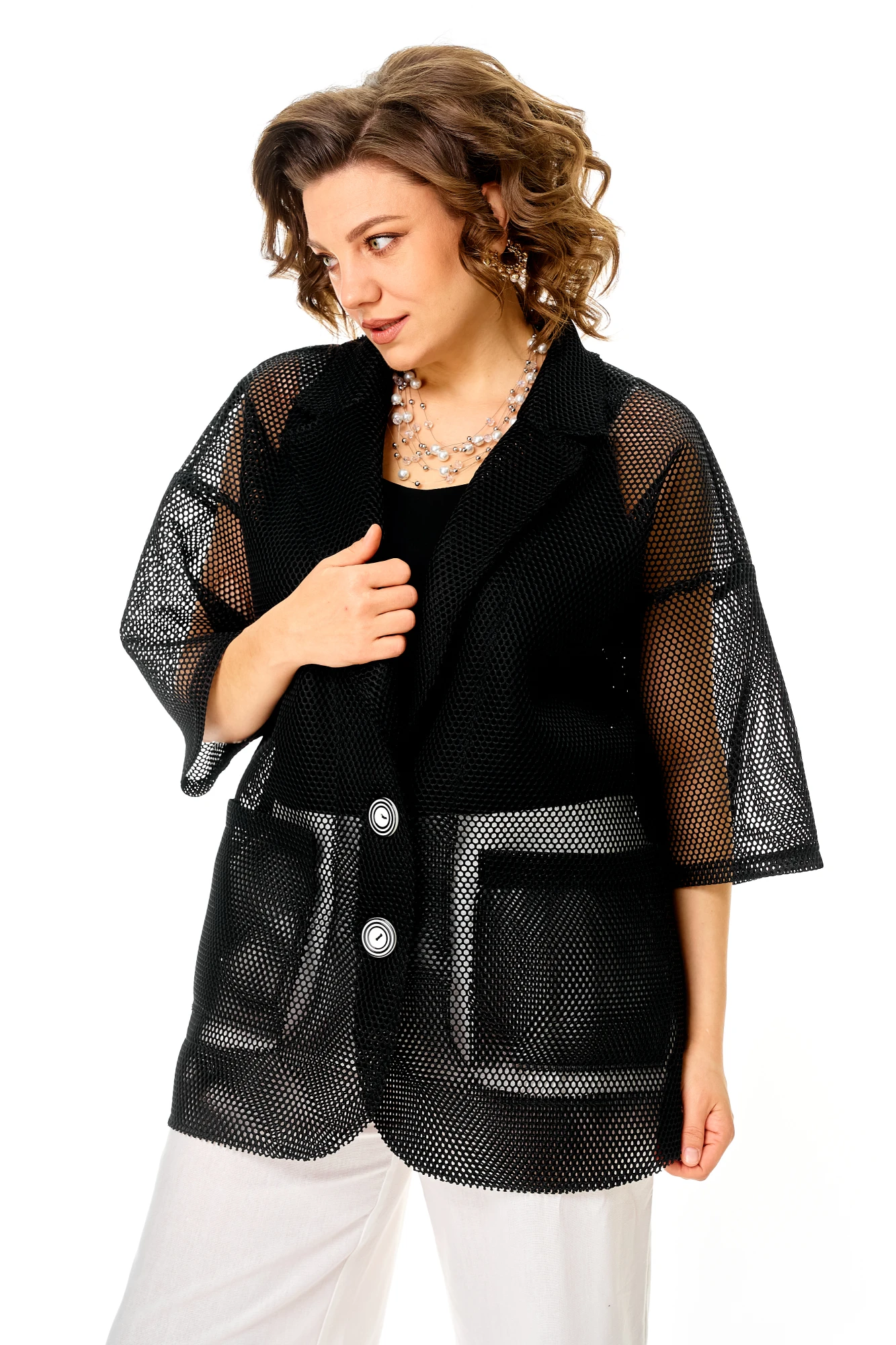 Жакет женский из оригинального трикотажного полотна, напоминающего объемные соты, станет отличным дополнением к вашему гардеробу. Модель прямого силуэта со спущенным рукавом, рукав 3/4 длины, застежка на пеллю и пуговицу, воротник пиждачного типа. По полочке идут накладные карманы, низ фигурный. Все шва и срезы не обработаны. Длина рукава: (50-66)-28см. Длина по спинке : (50-54)-76см., (56-60)-78см, (62-66)-80 см