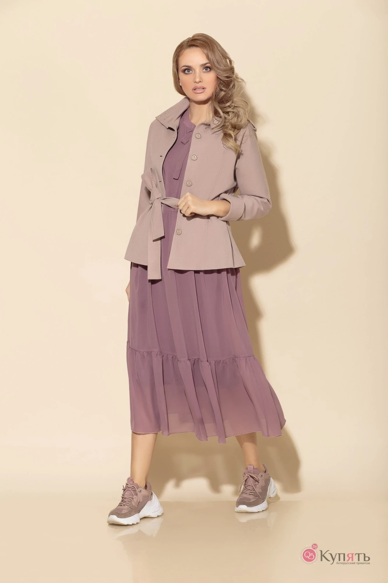 Жакет из мягкого текстильного полотна выполнен с длинными цельнокроеными рукавами, центральной застежкой на петли и пуговицы и высоким воротником-стойкой. Изделие на подкладке из вискозы. Жакет комплектуется поясом.