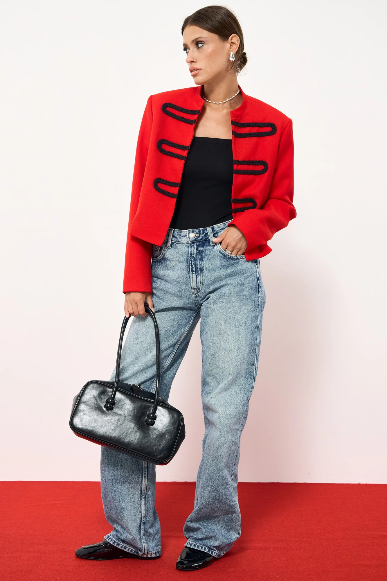 Жакет прямого кроя из костюмной ткани. Жакет без застежки. Горловина-стойка. Рукав втачной, есть подплечники. Жакет на подкладке. По переду жакета оттелка из декоративной тесьмы.