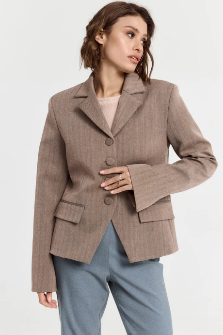 Жакет приталенного силуэта, в коричневом текстурном цвете. По переду карманы с клапанами, жакет по переду с застежкой на четыре пуговицы, обтянутые основной тканью изделия. Подкладка жакета в тон основной ткани изделия.
