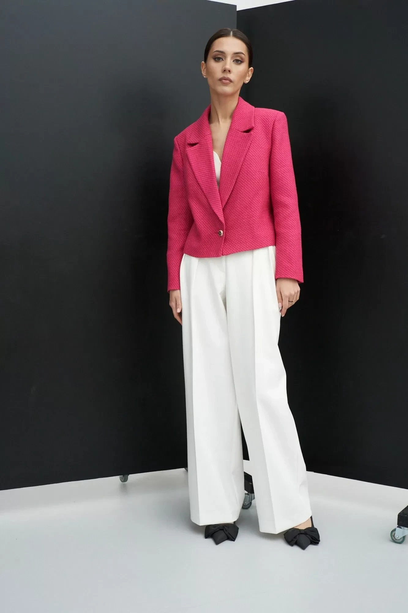 Характеристики: укороченный, подкладка, подплечники, отложной воротник с лацканом, застежка центральная на стильную петлю пуговицу, рукав втачной.