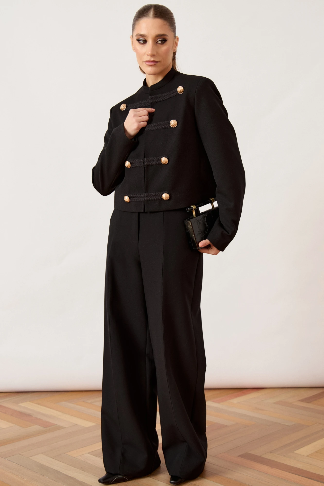 Жакет женский, укороченный, прямого силуэта, из плотной костюмной ткани в стиле милитари. Модель с воротником-стойкой и центральной бортовой застежкой (стык в стык) на потайные крючки или кнопки. Перед оформлен шестью декоративными горизонтальными патами из плетеного шнура, каждая из которых дополнена металлической пуговицей. Рукав втачной, двухшовный, классической длины. Изделие на притачной подкладке, плечевой пояс подчеркнут плечевыми накладками.
