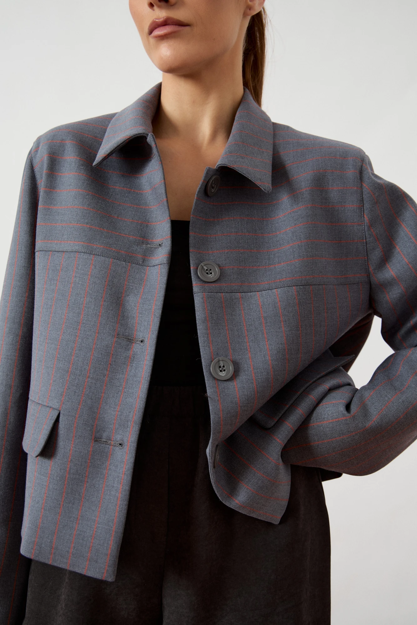 Жакет укороченный, прямого силуэта с отложным воротником и центральной бортовой застежкой на три петли и пуговицы. Полочка с горизонтальным подрезом выше линии груди и прорезными карманами с клапанами. Спинка с горизонтальной кокеткой. Рукав длинный, втачной, двухшовный.