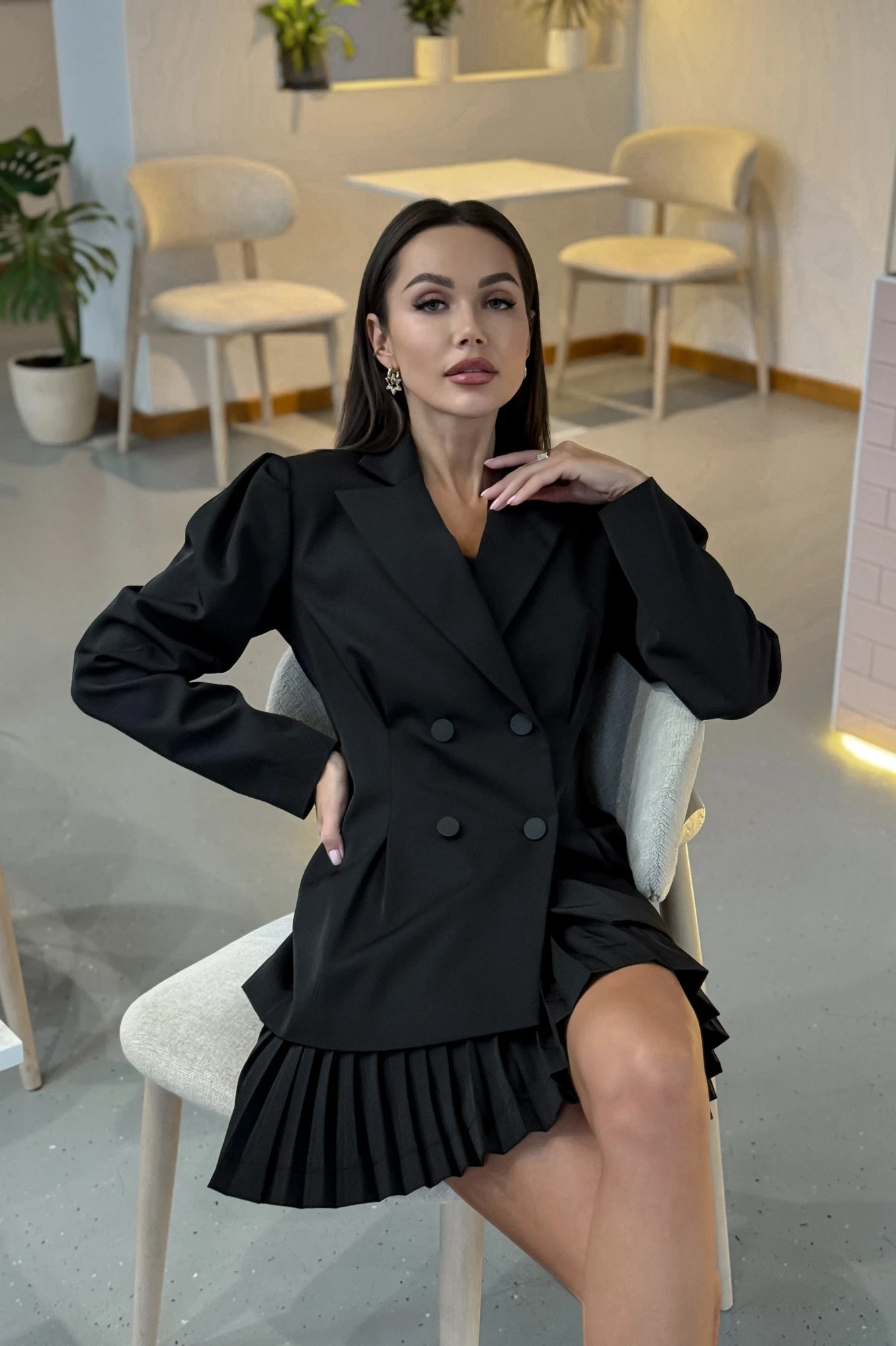 Жакет 2-бортный, на подкладке. Рукав длиннный, втачной, одношовный, по окату собран складками дляя увеления объёма. Обработаны талиевые вытачки по переду и спинке изделия