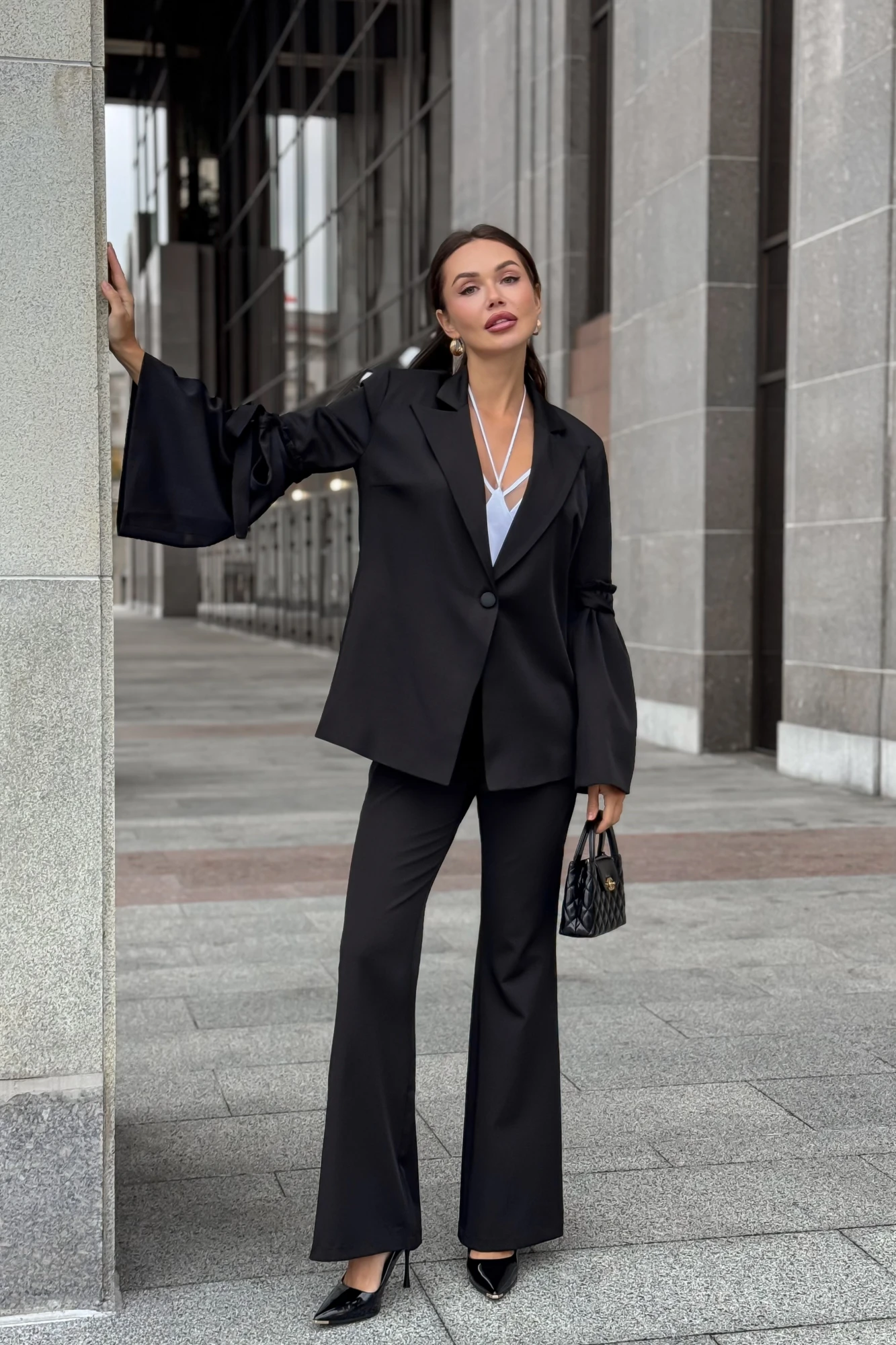 Жакет однобортный свободнго силуэта. Жакет обработан подкладкой. Рукав прямой, длинный, втачной, отрезной с пришитой присборенной деталью, шнурком из основной ткани для завязывания.