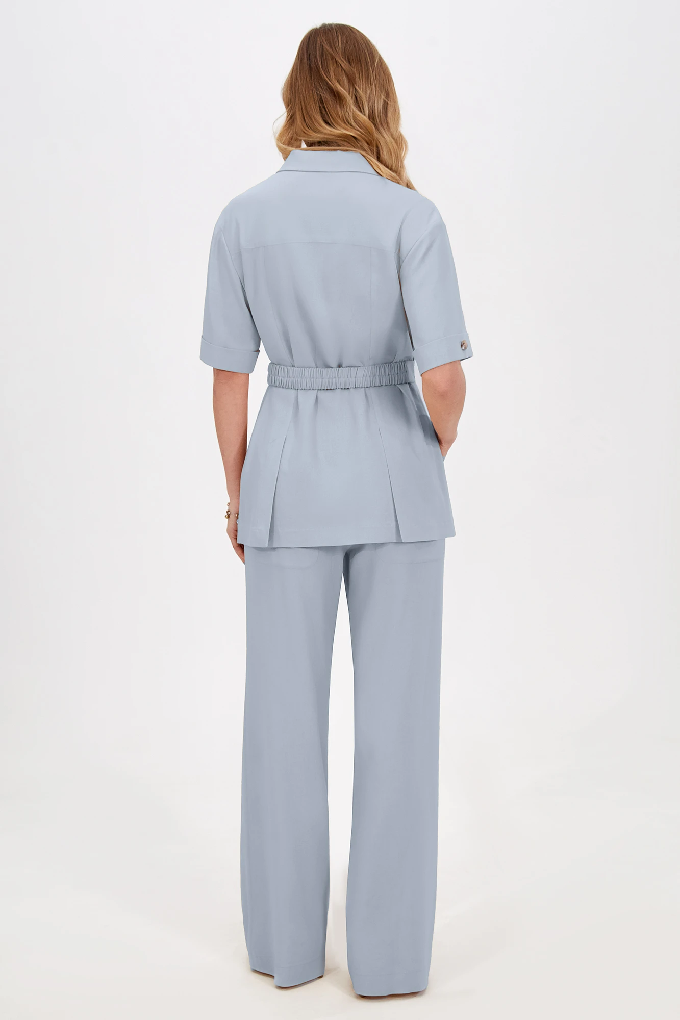В этом элегантном удлинённом жакете гармонично сочетаются классика и современные тренды. Смесовый материал на основе льна приятен в носке. Застёжка на пуговицы и два функциональных кармана добавляют модели практичности, а необычные кокетки с отделочными пуговицами привлекают внимание. Короткие рукава с отложными манжетами зафиксированы пуговицами. Шлицы по спинке добавляют комфорта, а интересный пояс в комплекте позволяет подчеркнуть талию. В пару можно подобрать широкие брюки, вышедшие в той же линейке.