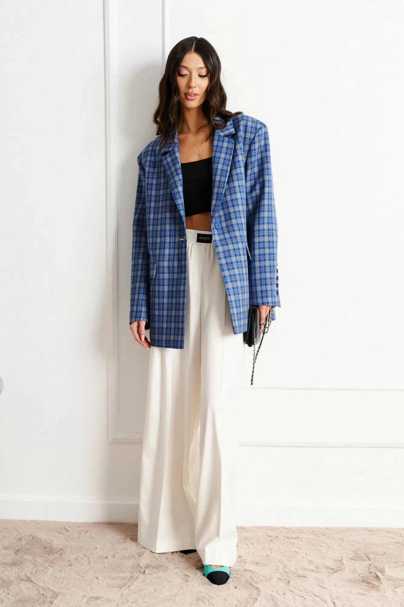 Жакет прямого свободного кроя выполнен из костюмной ткани. Характеристики: прямой свободный крой, подкладка, подплечники, воротник с остроугольным лацканом, застежка центральная на петлю - пуговицу, по переду функциональные карманы с клапаном, рукав втачной, по низу рукава нашиты пуговички, спинка со средним швом, в среднем шве разрез 24 см. Длина по спинке 76, длина рукава 63 см.