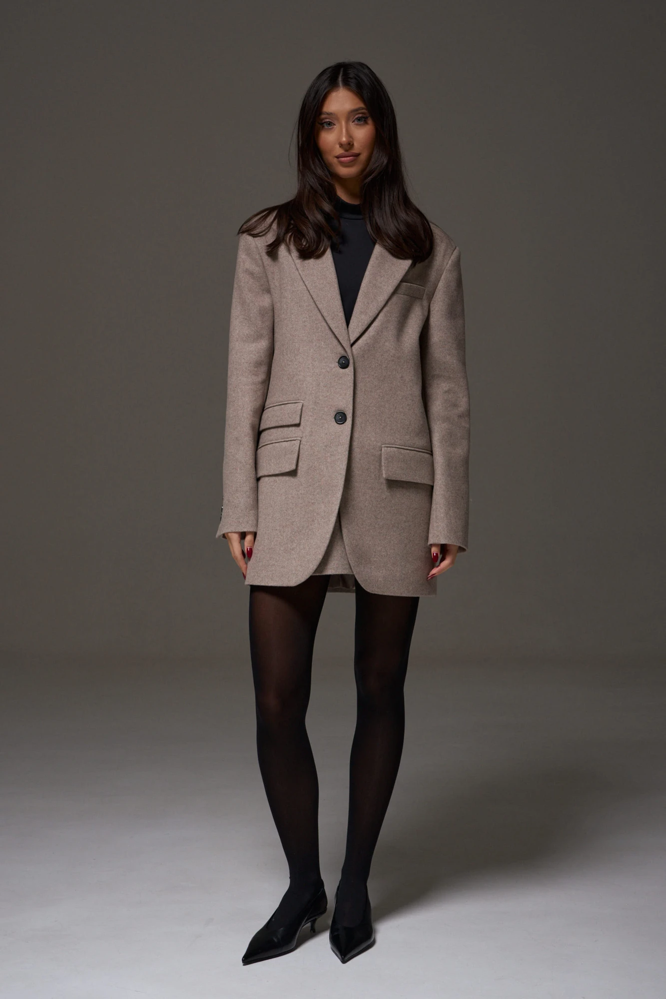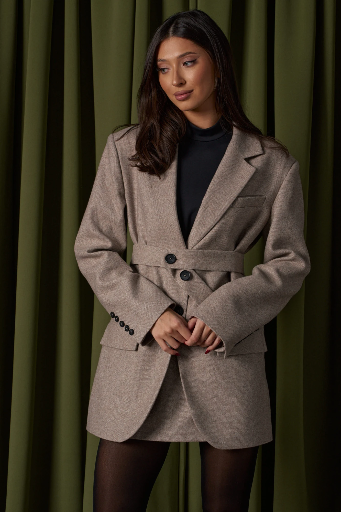 Жакет прямого свободного кроя выполнен из фактурного полотна. Характеристики: прямой свободный крой, подплечники, подкладка, отложной воротник с лацканом, застежка центральная на петли пуговицы, по переду прорезной кармашек «обманка», функциональный карман с клапаном, рукав втачной прямого кроя, по низу рукава нашиты пуговички. низ изделия с плавным срезом, в комплекте пояс из ткани основного изделия. Длина по спинке 80 см, длина рукава 61 см.