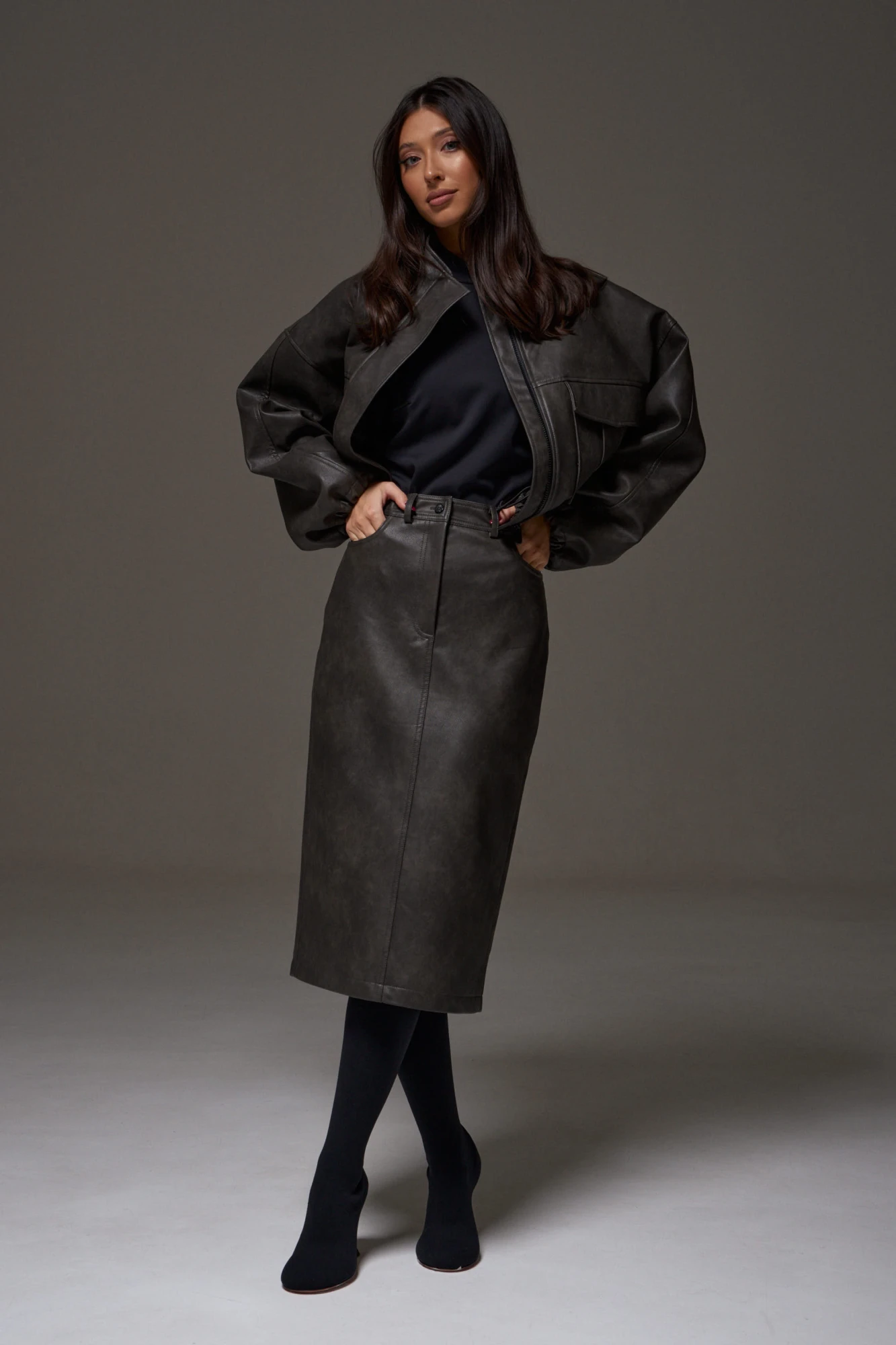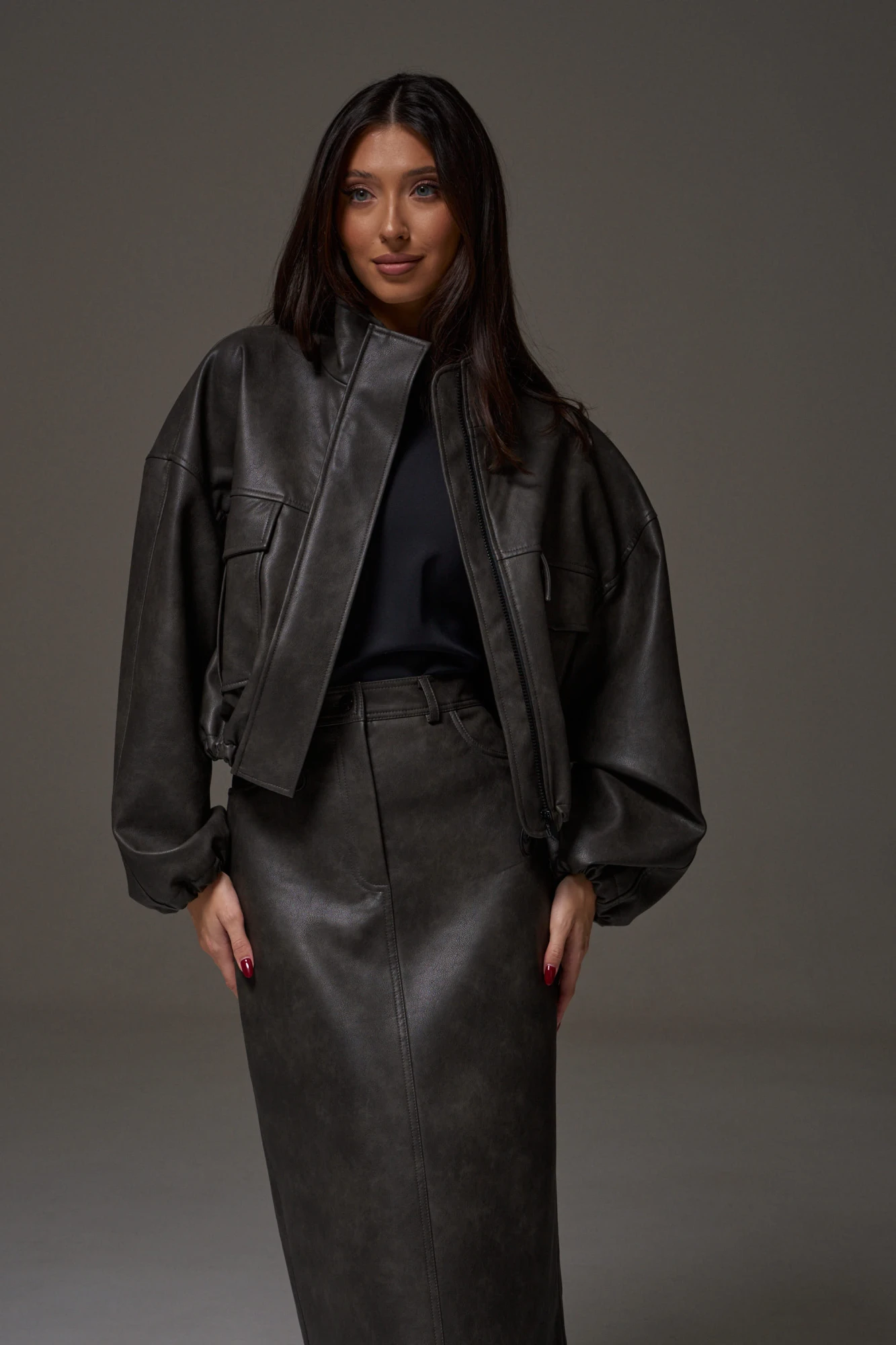 Укороченный жакет, выполнен из мягкой экокожи. Характеристики: прямой свободный крой, воротник стойка, по переду нашиты два кармана с клапанами, брендированная подкладка, застежка центральная на молнии скрыта под планкой. Плечо спущенно, манжета рукава на резинке с фиксатором. Низ изделия на резинке с фиксатором. Длина спинке 50см, длина рукава от края горловины 76см.
