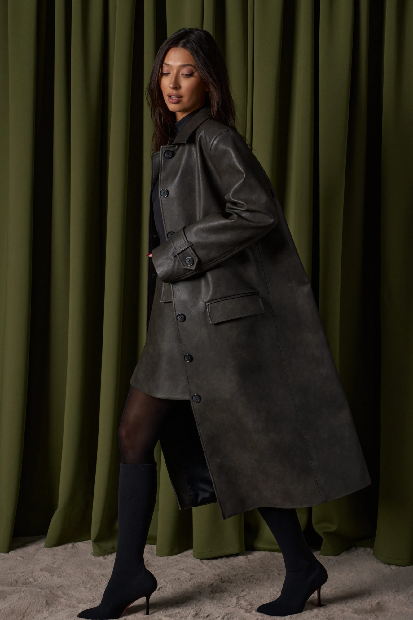 Удлиненный жакет прямого свободного кроя, выполнен из экокожи. Характеристики: отложной воротник, застежка центральная на петли - пуговицы. Брендированная подкладка, подплечники. Рукав втачной, по низу рукава пата с пуговицей. В комплекте идет пояс из основной ткани изделия. По переду карманы с клапаном. В среднем шве спинки шлица 44см. Длина изделия 117 см, длина рукава от края горловины 79.5 см.