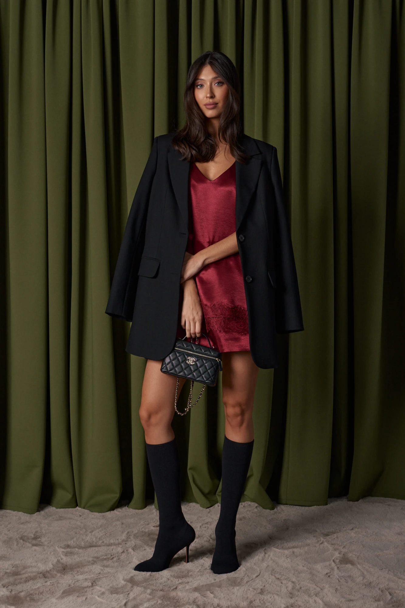 Жакет прямого свободного кроя. Выполнен из костюмной ткани чёрного цвета. С подкладкой. Воротник отложной, с лацканами. Рукав втачной. Есть подплечники. По переду карманы с клапанами. Застёжка центральная - пуговицы. Разреза и шлицы в жакете нет. Длина рукава от линии втачивания 65 см. Длина спинки 82,5 см