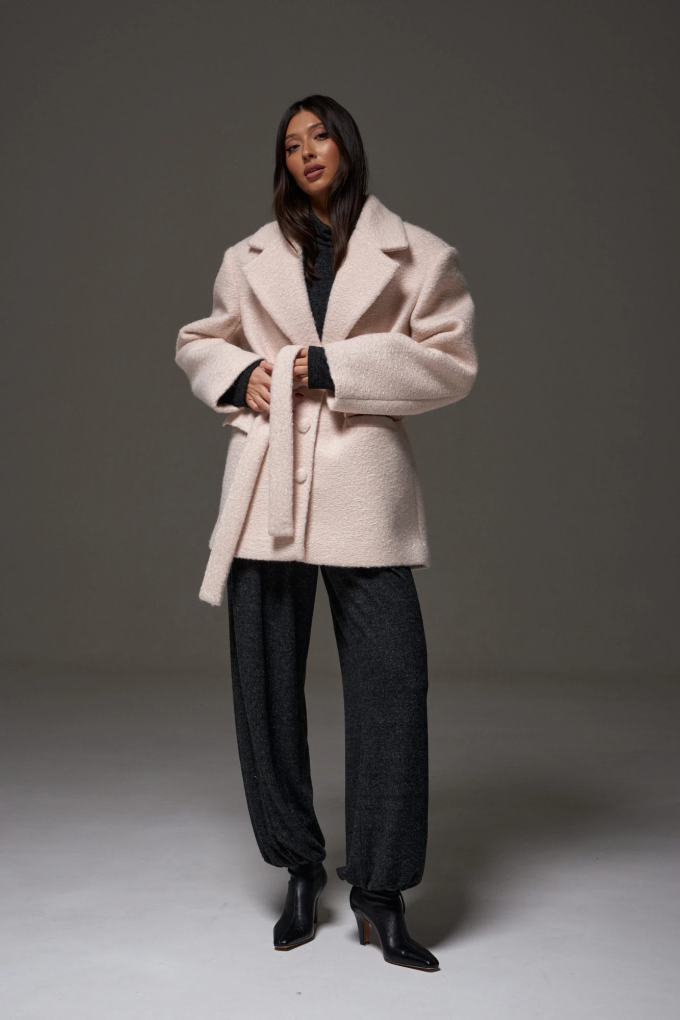 Полупальто однобортное прямого кроя, выполнено из полотна бежевого цвета ворсистой текстуры. Характеристики: прямой крой, брендированная подкладка, воротник с остроугольным лацканом, застежка центральная на петли - пуговицы, по линии талии шлевки, в комплекте пояс из ткани основного изделия, по переду функциональные карманы, рукав втачной, спинка цельнокройная. Длина по спинке 78 см, длина рукава 60 см.
