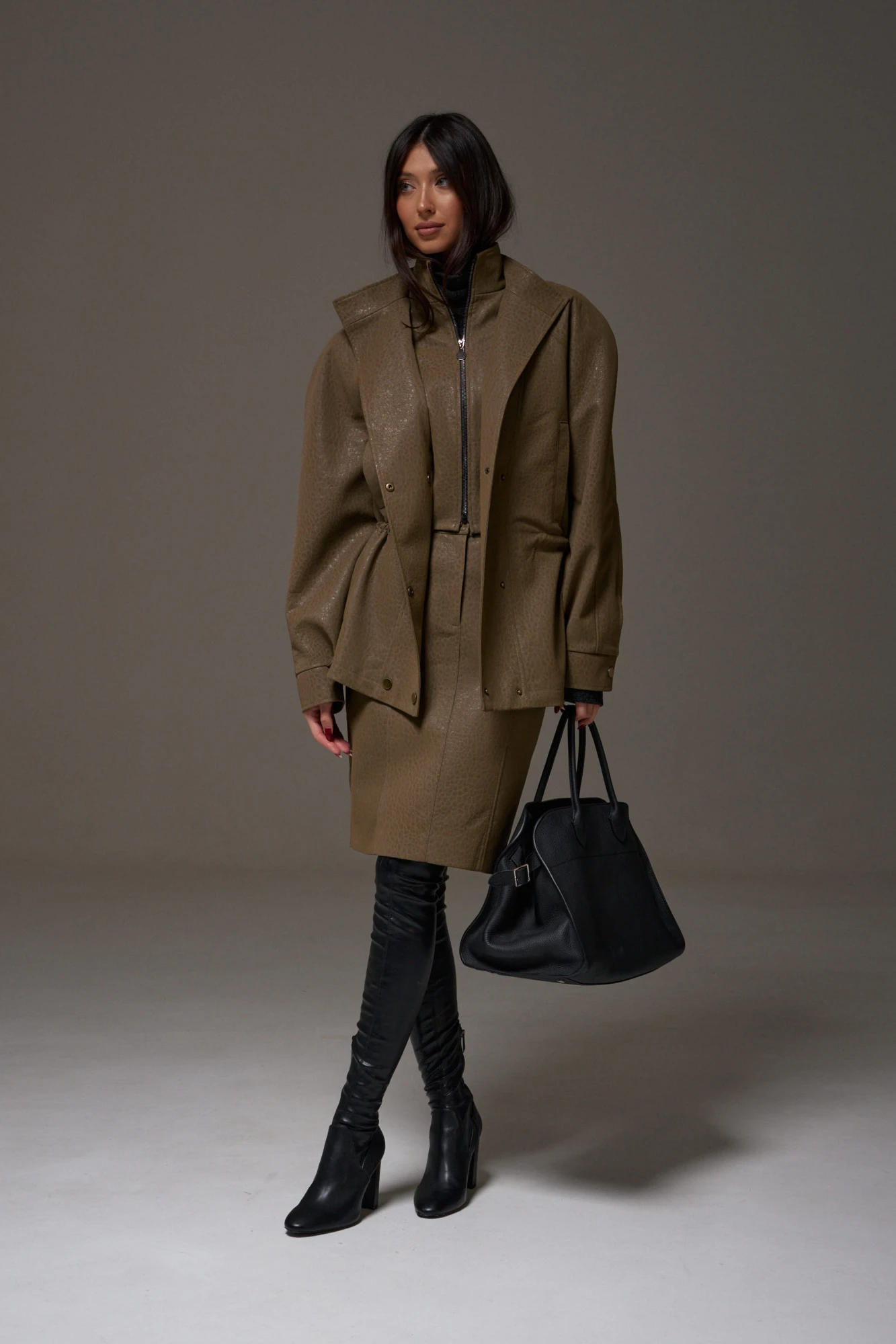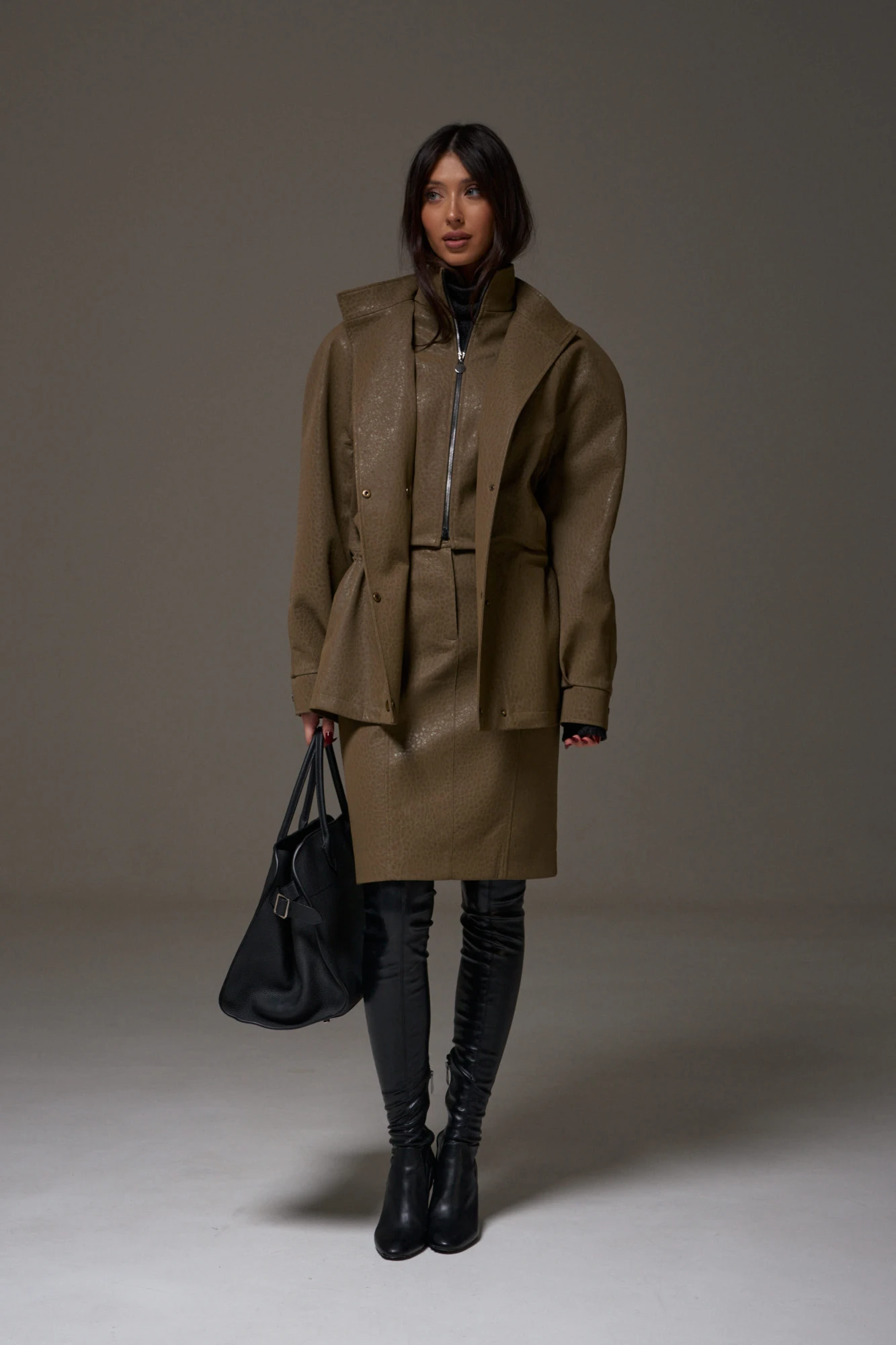 Жакет с акцентной талией, выполнен из эко-кожи цвета хаки. Характеристика: прямой свободный крой. Пояс изделия на резинке с фиксатором во внутренней части. Брендированная подкладка. Горловина стойка, манишка из основной части изделия на молнии. Застежка центральная двубортная на шесть кнопок. Скрые карманы в части груди. Рукав реглан, центральная часть прошита планкой, низ рукава фиксируется кнопкой. Длина по спинке 72.5 см, длина рукава от края горловины 80см.
