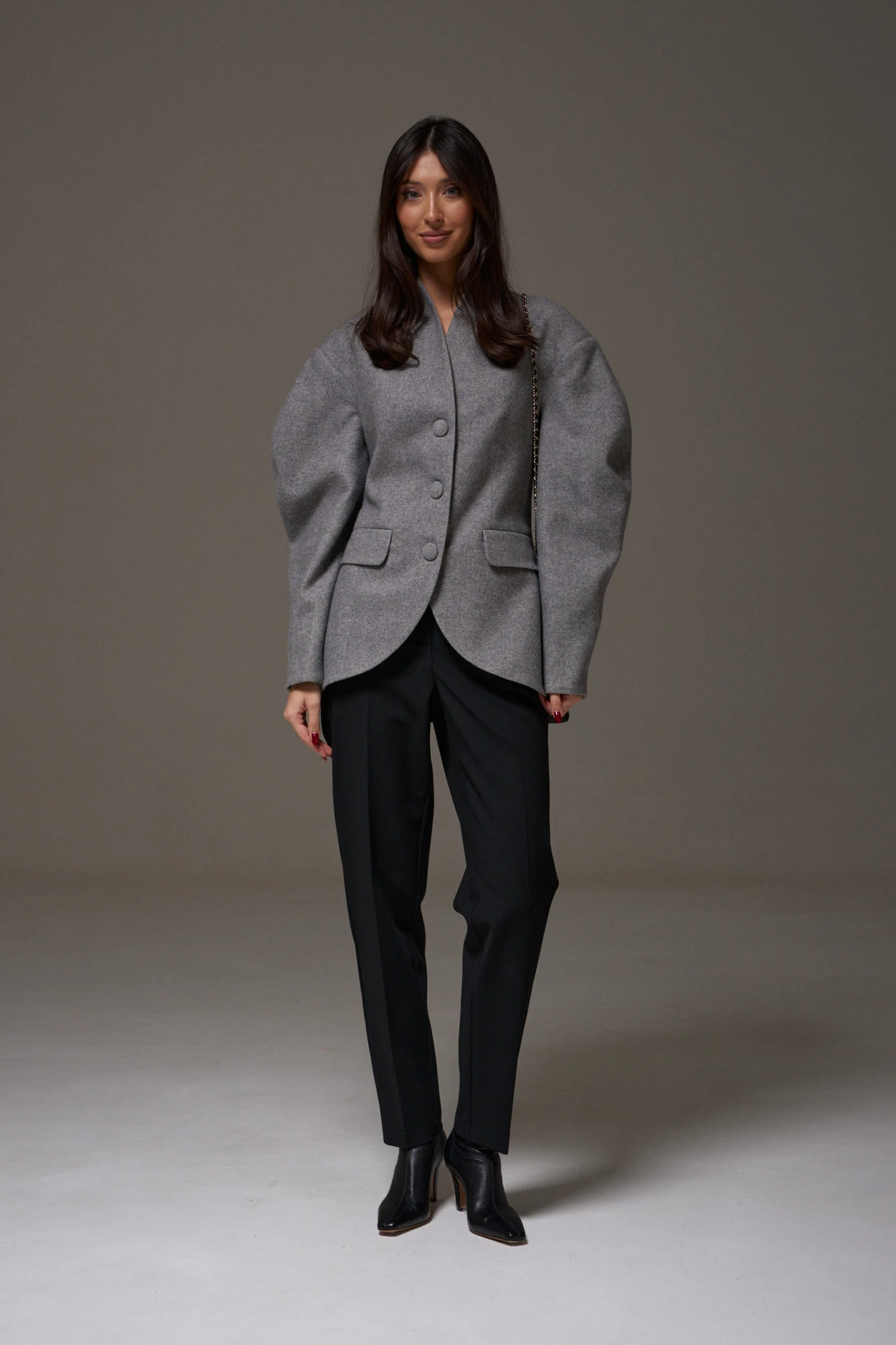 Жакет прилегающего силуэта. Выполнен из фактурного полотна серого цвета. С подкладкой. Воротник-стойка. Вырез горловины V-образный. Рукав втачной, объёмный, заужен к низу. По переду карманы с клапаном. Застёжка центральная - пуговицы. Низ жакета фигурный. Длина спинки 69 см. Длина рукава от линии втачивания 63 см