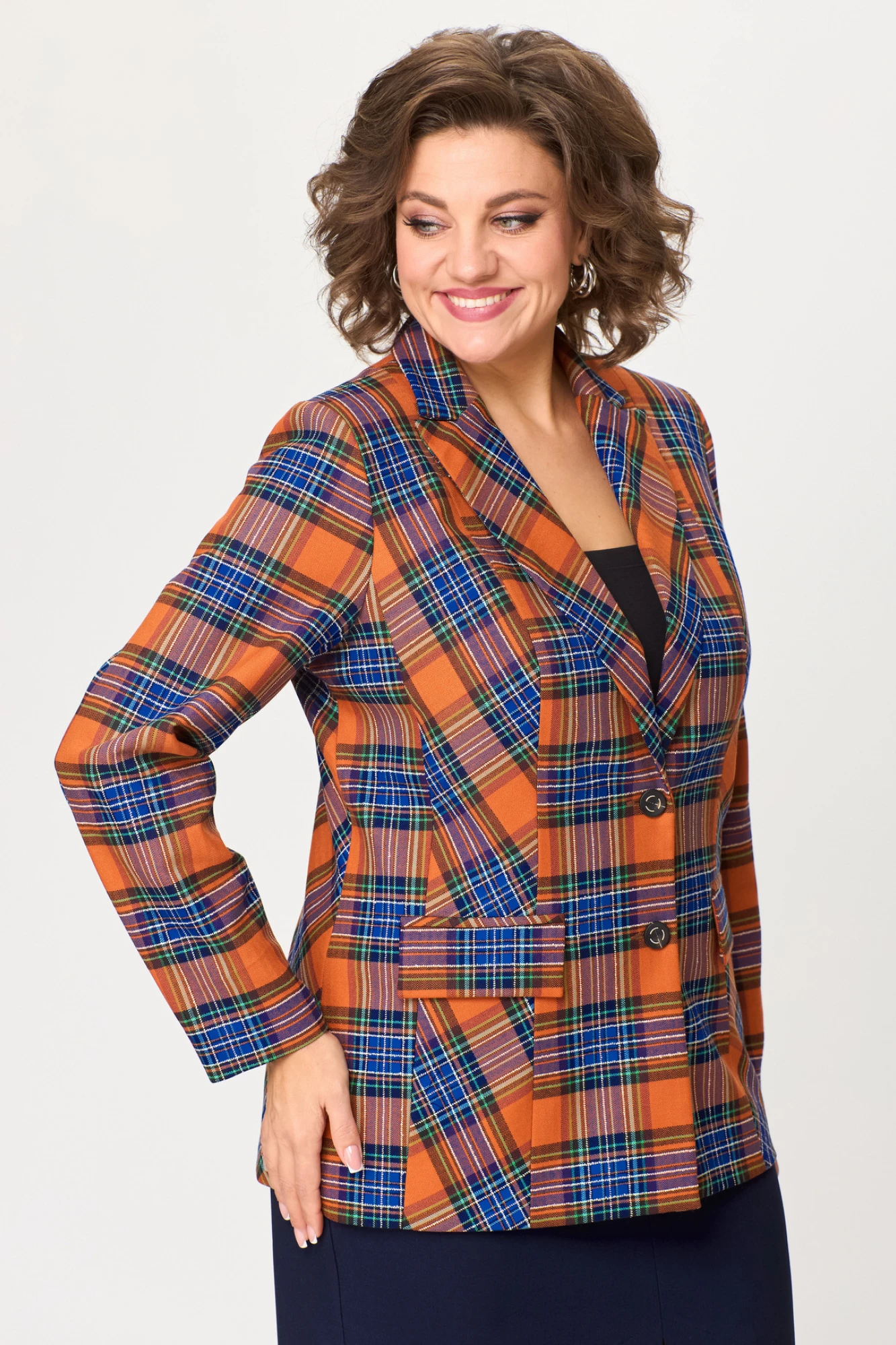 Жакет женский удлиненный, из текстильной ткани, на подкладке, полуприлегающего силуэта с центральной бортовой застежкой на пуговицы до линии перегиба лацкана. Спереди рельефные швы от плечевого шва, отрезной бочок и карман с клапаном. Спинка с рельефами от плечевого шва. Рукав втачной, двухшовный. Воротник пиджачного типа.