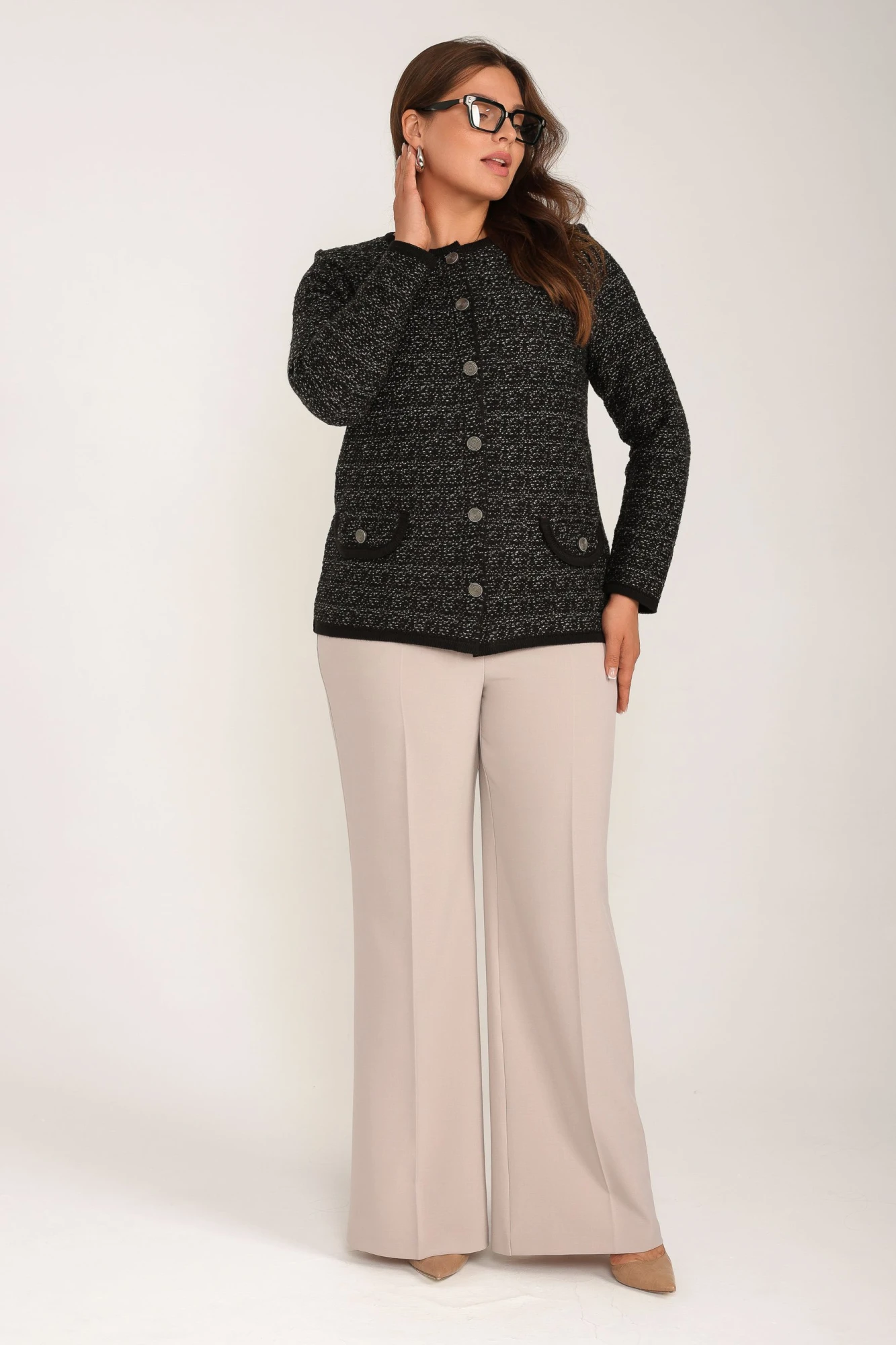 Жакет под твид - основа стильного гардероба каждой женщины. Будучи выполненным из мягкого трикотажа, он обеспечит комфорт и легкость движений. Жакет женский больших размеров полуприлегающего силуэта, длиной до линии бедер, рукав длинный. Пиджак держит форму и скрывает особенности фигуры, отлично сочетается с любой одеждой. Он разбавит Ваш повседневный стиль. Вязаный твидовый жакет удачно впишется в образ делового, офисного и повседневного гардероба. Наши изделия подойдут на любой возраст.