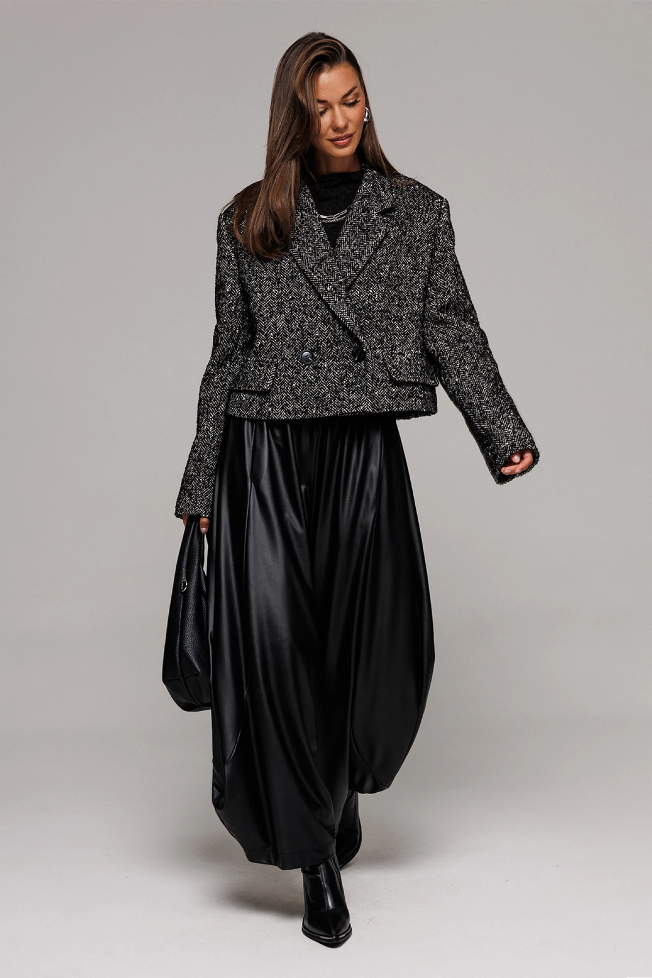 Жакет укороченный прямого силуэта, двубортный с втачным двухшовным рукавом. Полочка с застежкой на петлю-пуговицу и имитацией кармана с клапаном и отрезным бочком. Спинка с отрезным бочком и центральным швом. Воротник пиджачного типа с отрезной стойкой. Жакет на подкладке.